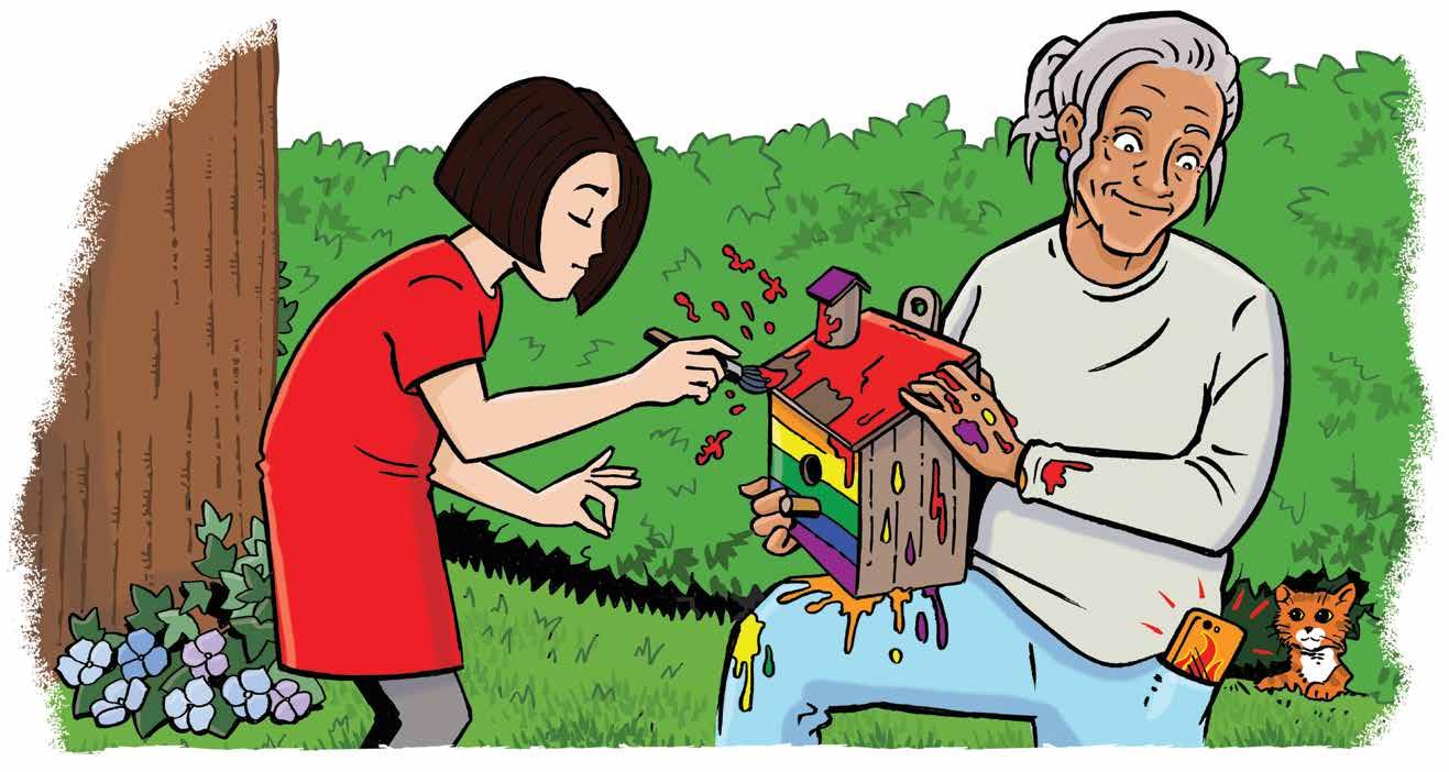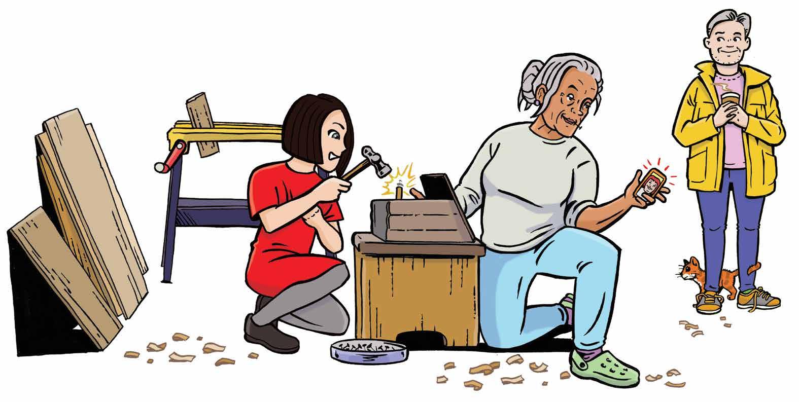 Katja och farmor bygger ofta saker tillsammans. I dag ska de göra färdigt fågelholken.