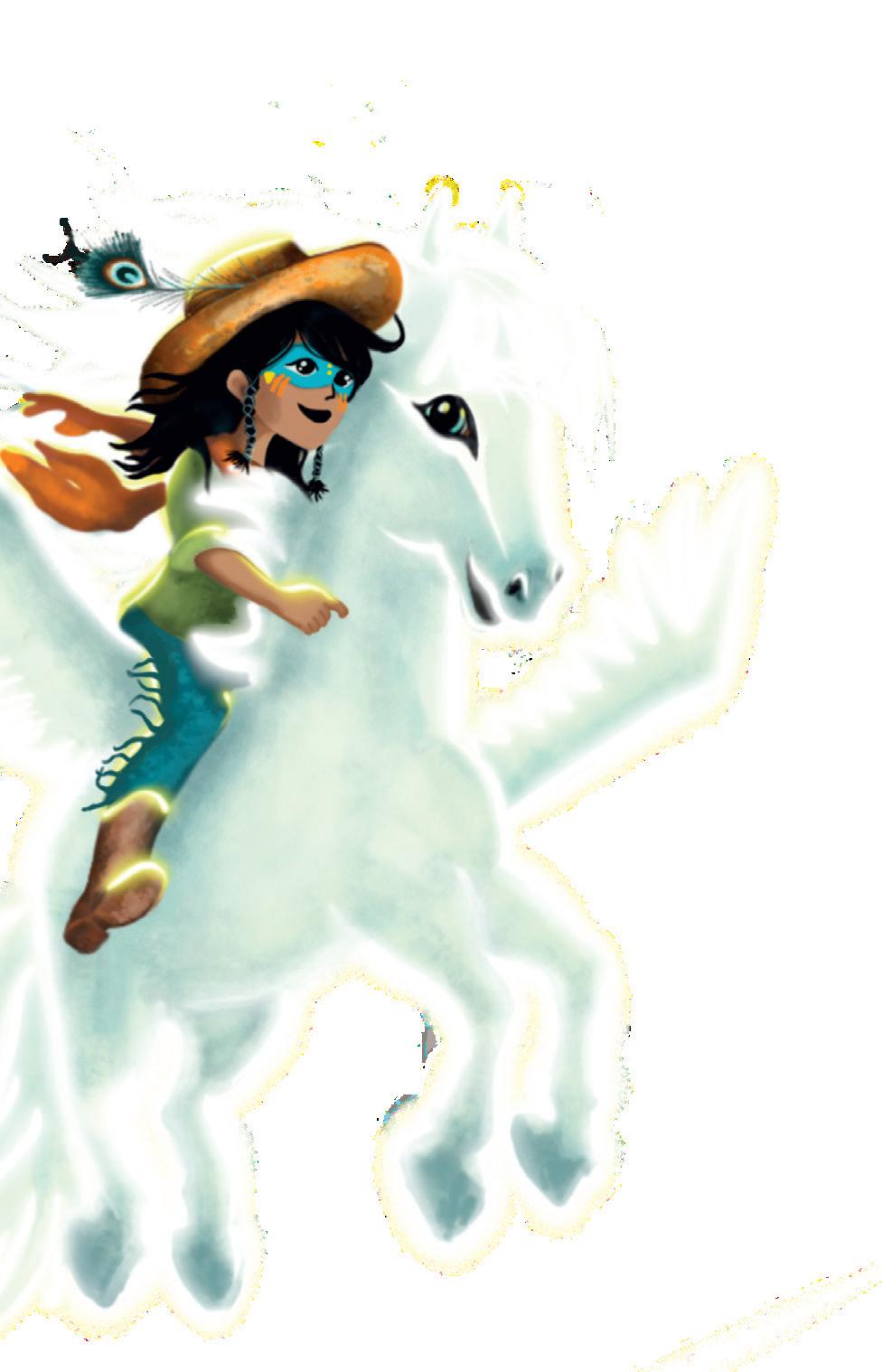 Neo hoppade upp på Hästens rygg och tillsammans susade de iväg i full fart. Påfågelsfjädrarna på Neos väst dansade i vindens riktning och fransarna på hans byxor gungade i takt med hästens man. Hästen hade stora, vita vingar som fälldes ut när de ville rida superfort.