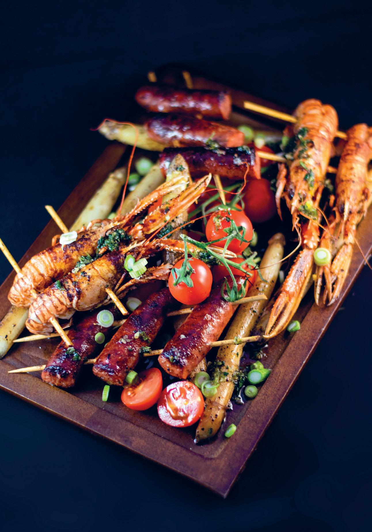 5. När grillen är riktigt het (eller stekpannan), börja med att grilla korvarna så att de är nästan klara, lägg då på kräftspetten och sparrisen. Kräftorna ska svärtas lätt så det är ok om det slår upp lite lågor av oljan. När allt fått riktigt fin, bränd yta, lägg över alla spetten på en stor skärbräda, sprid ut sparrisen och tomaterna, bryt bitar av brödet och ringla över basilikaoljan. Avsluta med lite skuren salladslök, flingsalt, svartpeppar, cayennepeppar och hugg in.