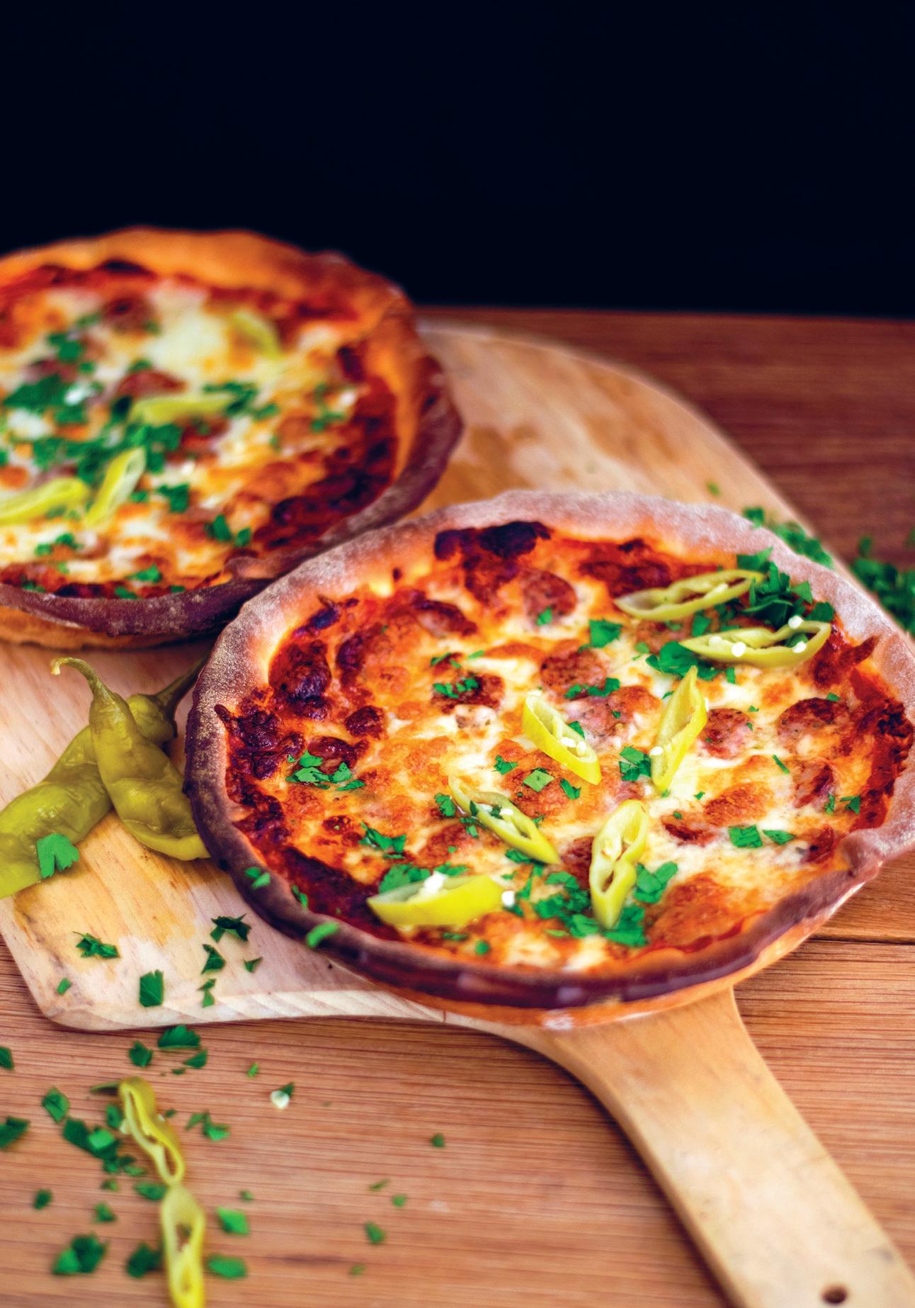 1. Sätt ugnen på 225°C med en baksten på plats. Rör ihop salt, socker, jäst, olja och vatten i en bunke. Vänd ner lite mjöl i taget och blanda väl tills ni får en fin och elastisk deg. Det mjöl som blir över sparas till utbakning. Jäs degen under duk i 25 minuter. Dela därefter degen i fyra delar och kavla ut pizzorna på välmjölat bord. Tryck ut degen i pan pizza-portionsformar eller i mindre pajformar, cirka 20 cm i diameter.