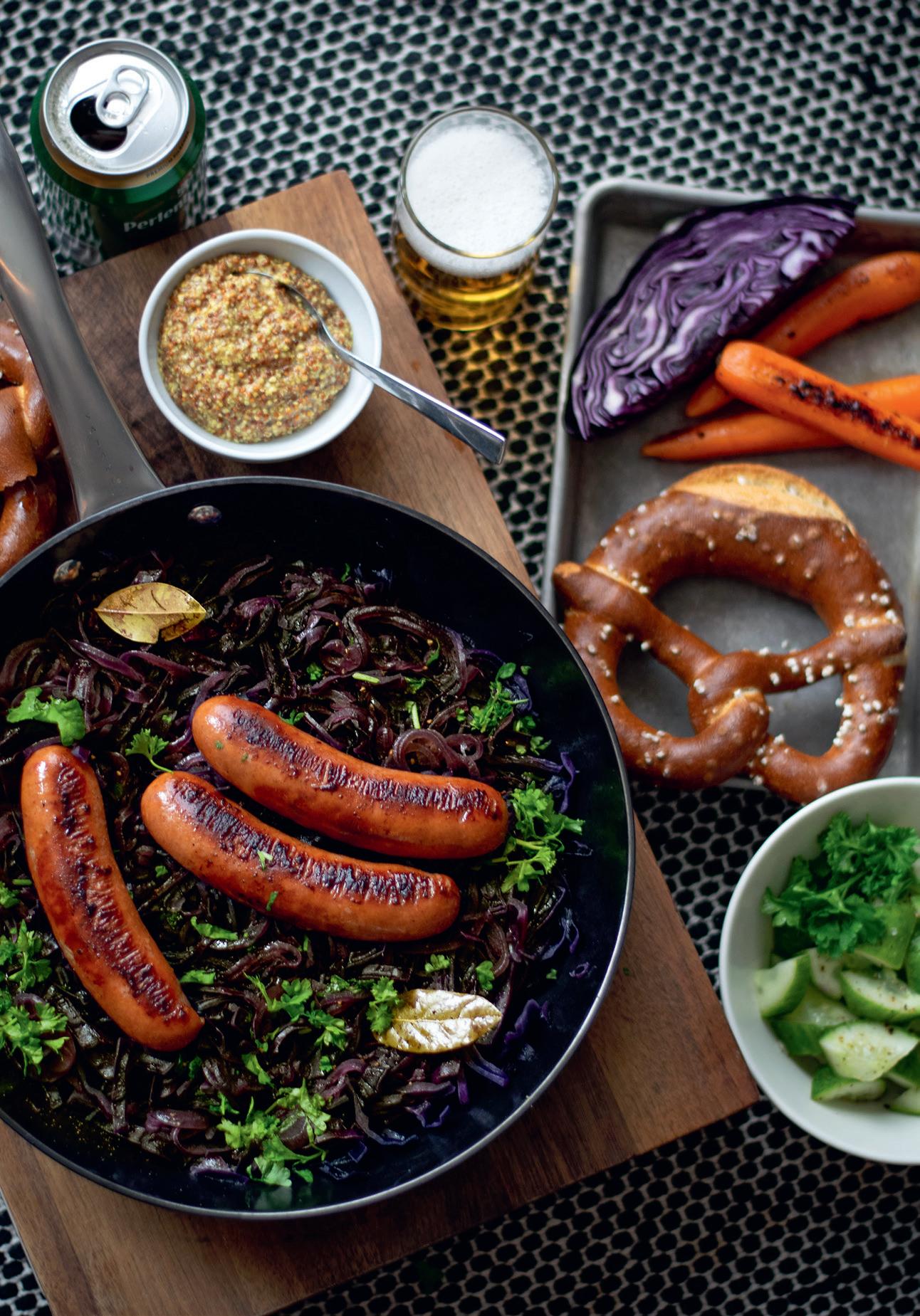 4. Lägg ner korvarna i pannan och låt värmas några minuter innan service. Garnera med sparad persilja. En kall och riktigt krispig gurksallad är gott till och så klart pretzels och senap. Kanske till och med en öl till..?