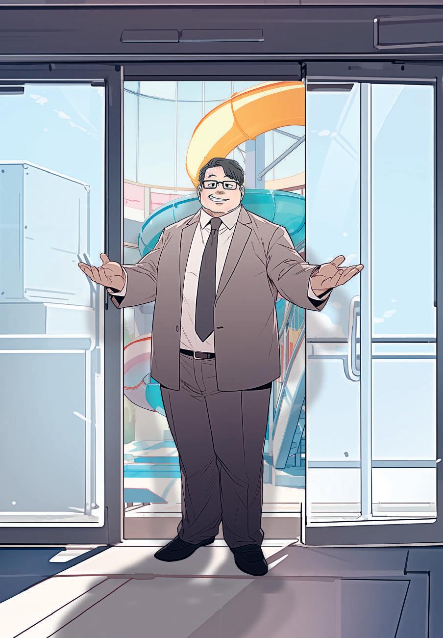 Barnen springer fram till entrén där badchefen Boris väntar på dem. Han ska visa familjen runt och prata med mamma och pappa om inspelningen.