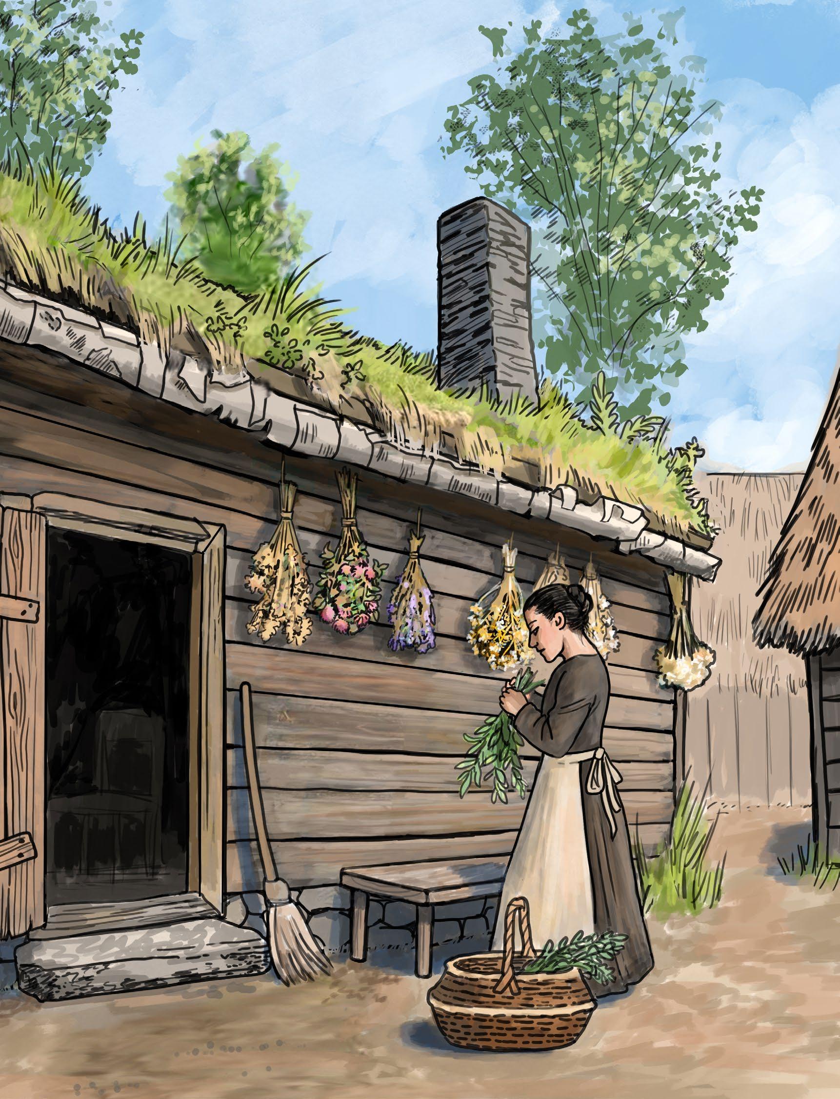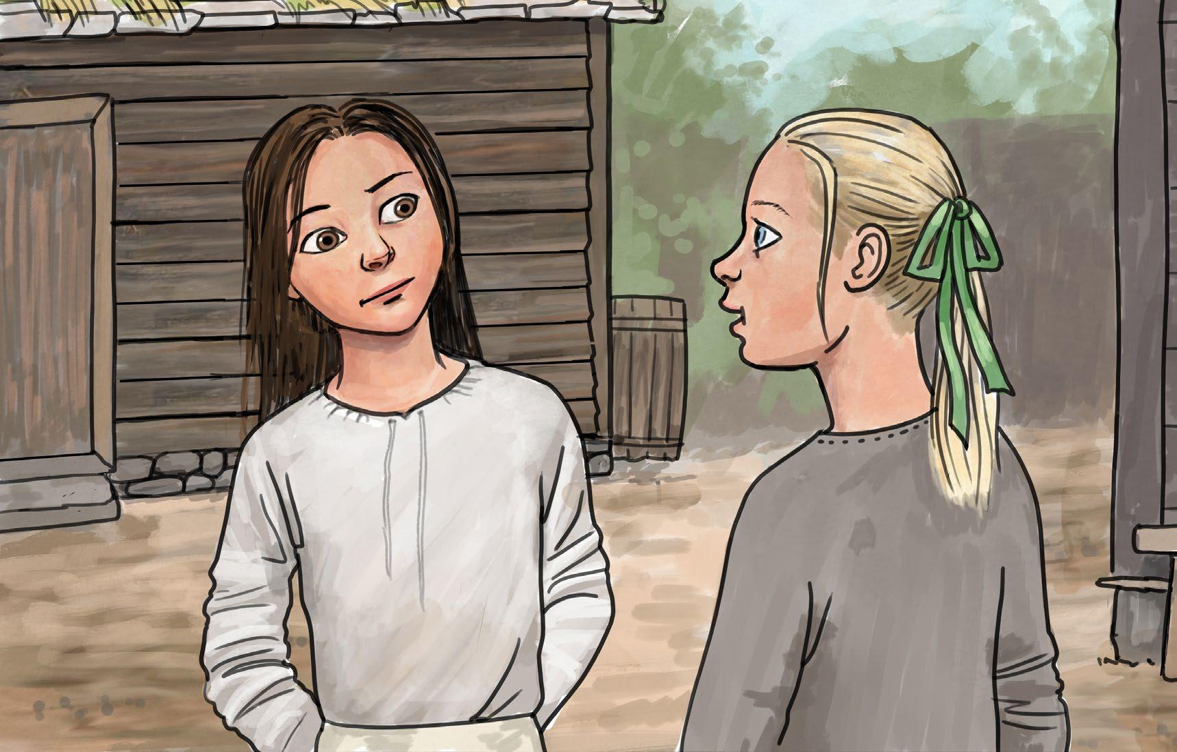 Eftersom det inte har regnat på flera veckor är gatorna torra och det dammar runt barnens bara fötter. Stina tycker att det är skönare så här än när det är lerigt. Men de måste se upp så att de inte trampar i de färska högarna av hästbajs. Nästan alla hus i stan är likadana; låga, gråa trähus med torvtak. Ja, till och med stall och bodar ser ut så, fast de har halm på taket istället. Stina tycker ändå att hennes hem är lite finare än alla andras. Det kan bero på alla blommorna som hänger på tork under öfset längs framsidan. Eller kan-