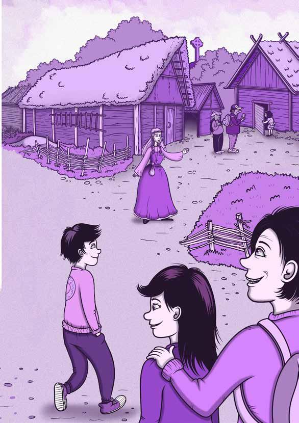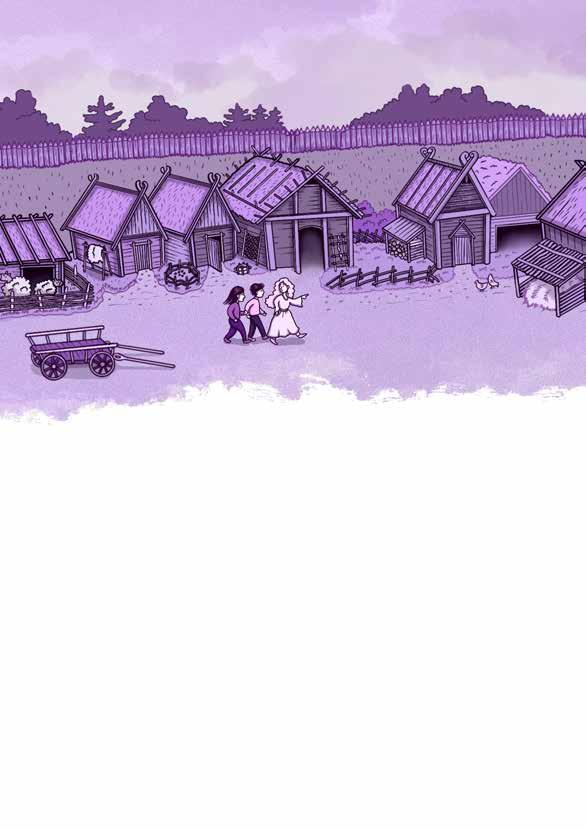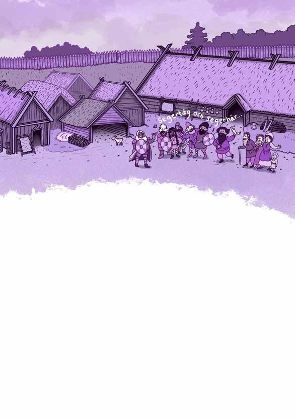 mamma och gruppen. Längre fram tornar ett större hus. Utanför har alla vikingar samlats.