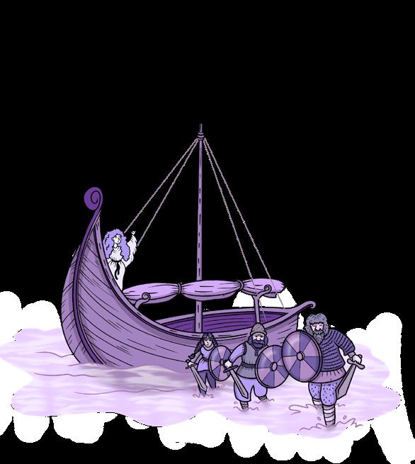 till och människor med svärd och sköldar vadar i hamn. Kvinnan som står i fören har långt tovigt