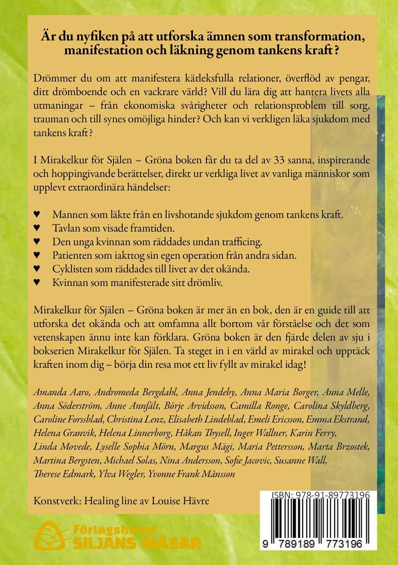 Varför skriver jag detta i förordet till Mirakelkur för Själen? Jo, jag vill att alla ska känna att de har kraften, kunskapen och förmågan att hela sitt liv och – i nästa steg – världen. Tillsammans kan vi skapa de förändringar vi behöver för en vackrare, fredligare och mer meningsfull värld. Det börjar inom var och en av oss och vi behöver få tillbaka tron på vår förmåga att påverka. För dig som är ny läsare av Mirakelkur för Själen önskar jag dig extra varmt välkommen och ger dig en snabbis till bakgrunden hur projektet kom till. Är du mer nyfiken rekommenderar