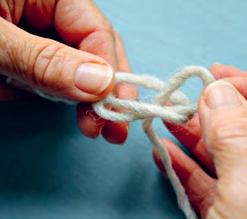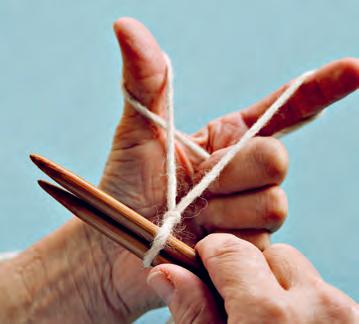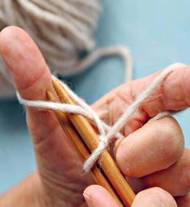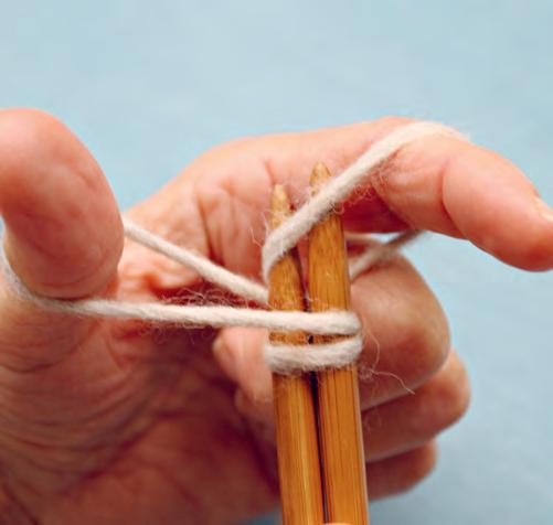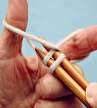 5. Stoppa in vänster tumme och pekfinger mellan trådarna och för dem isär. Då dras maskan åt om stickorna. Du håller nu garnet med handflatan mot dig.