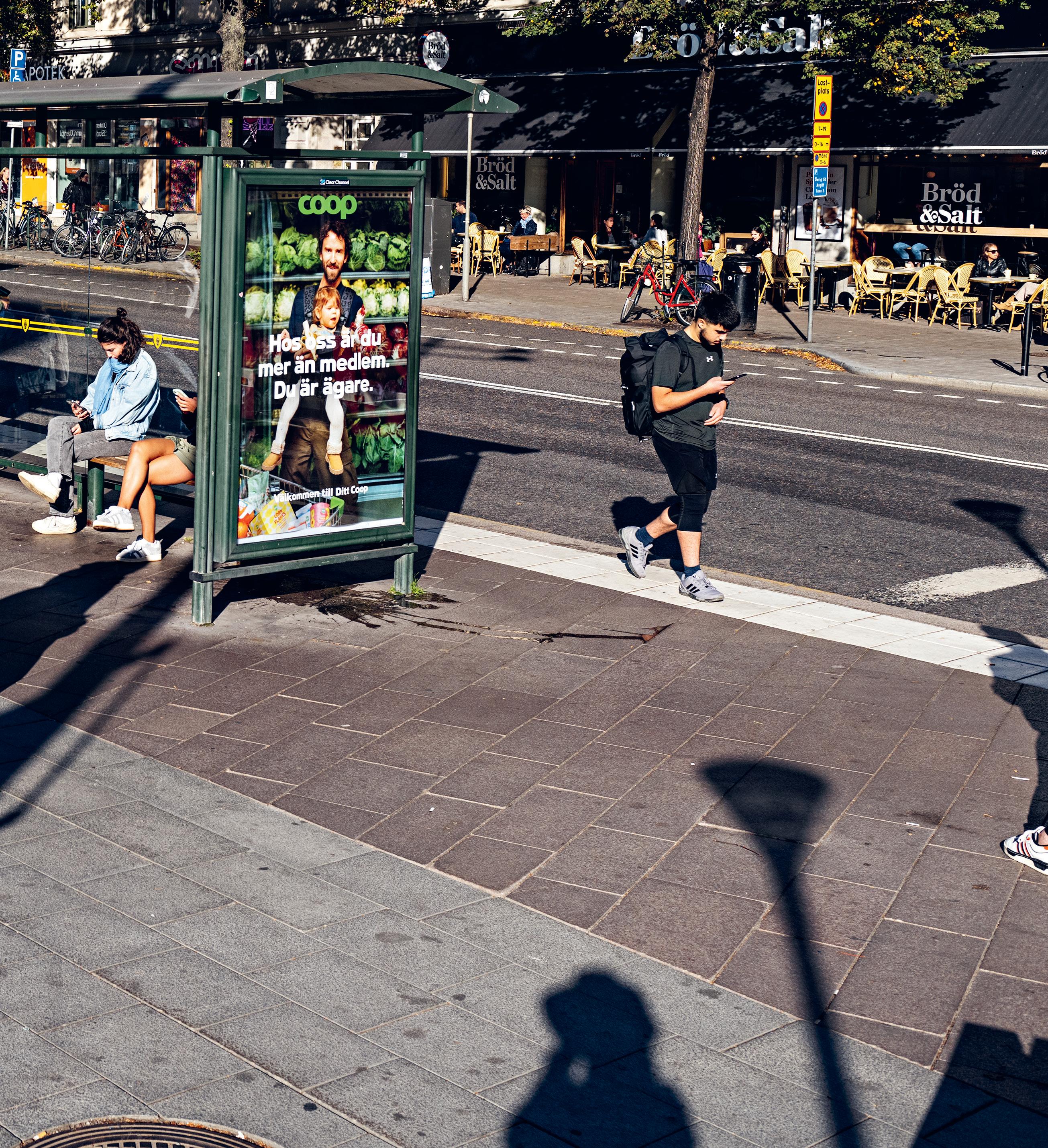 Jag bor i stan. Här är det mycket trafik och många människor.