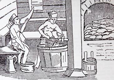 Så här kunde det se ut i en badstuga på medeltiden. Här syns en välvd ugn och den samling stenar som vid bad värmdes upp och som man hällde vatten över. Mannen som sitter på bänken dricker mjöd ur ett horn och har även små kopphorn på kroppen. Bild från verket Historia om de nordiska folken, av Olaus Magnus.