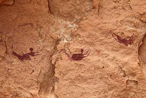 Här syns simmarna som är målade på grottväggen i Wadi Sura. Det finns också teorier om att de simmande människorna egentligen föreställer döda personers själar som flyter omkring. Foto: Roland Unger / CCBY-SA3.0 / Wikimedia Commons
