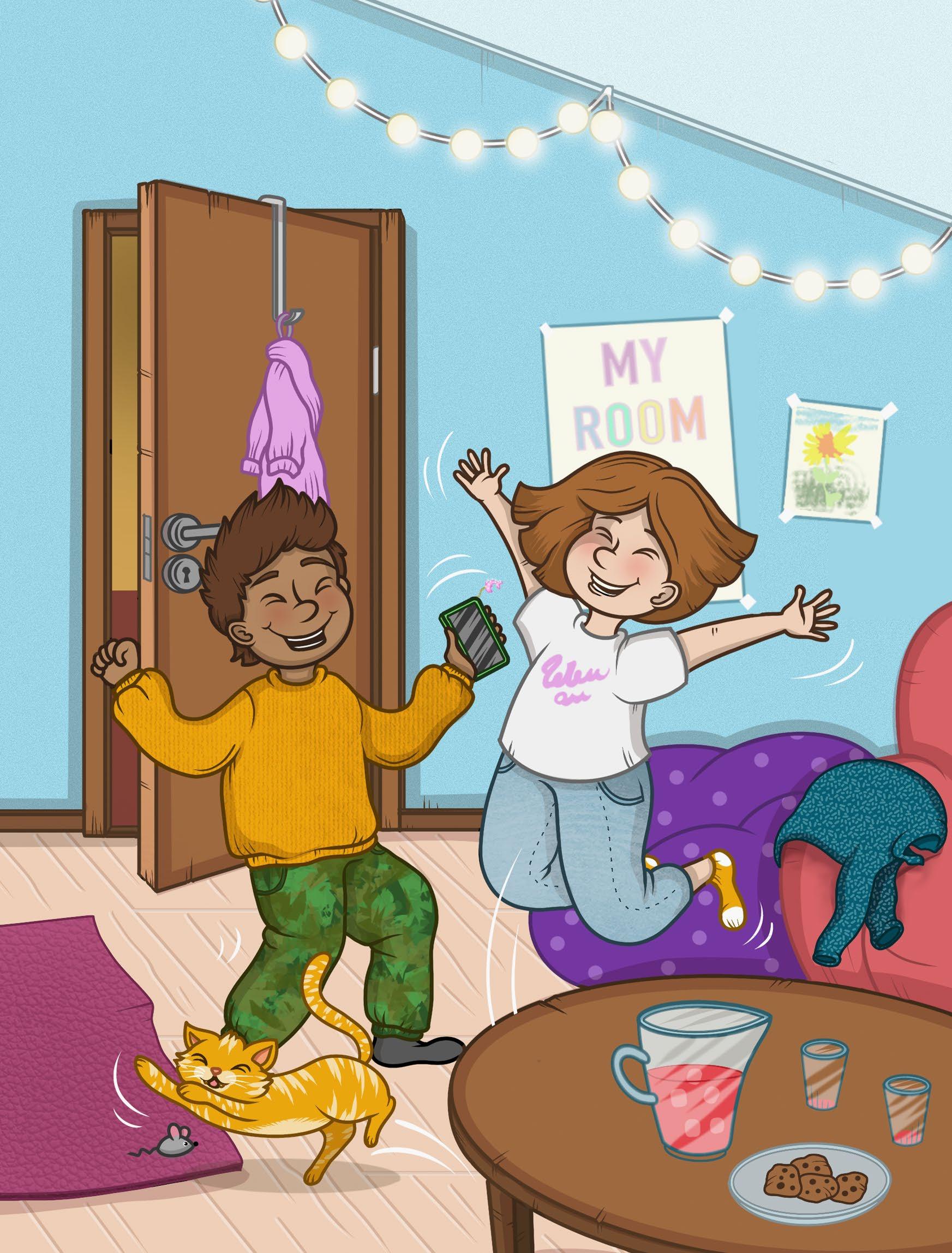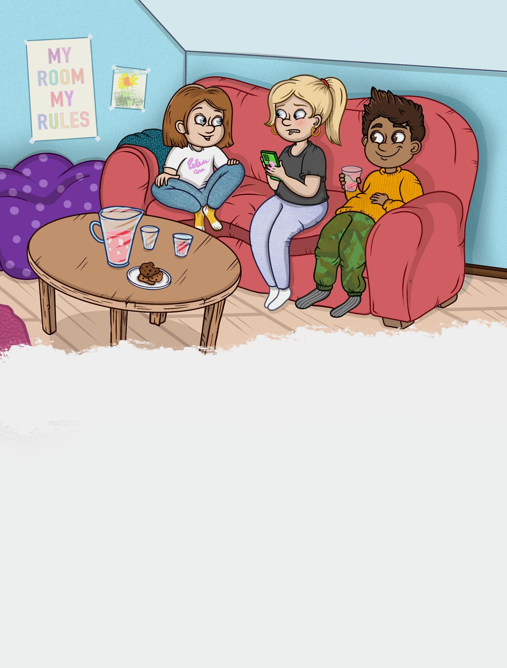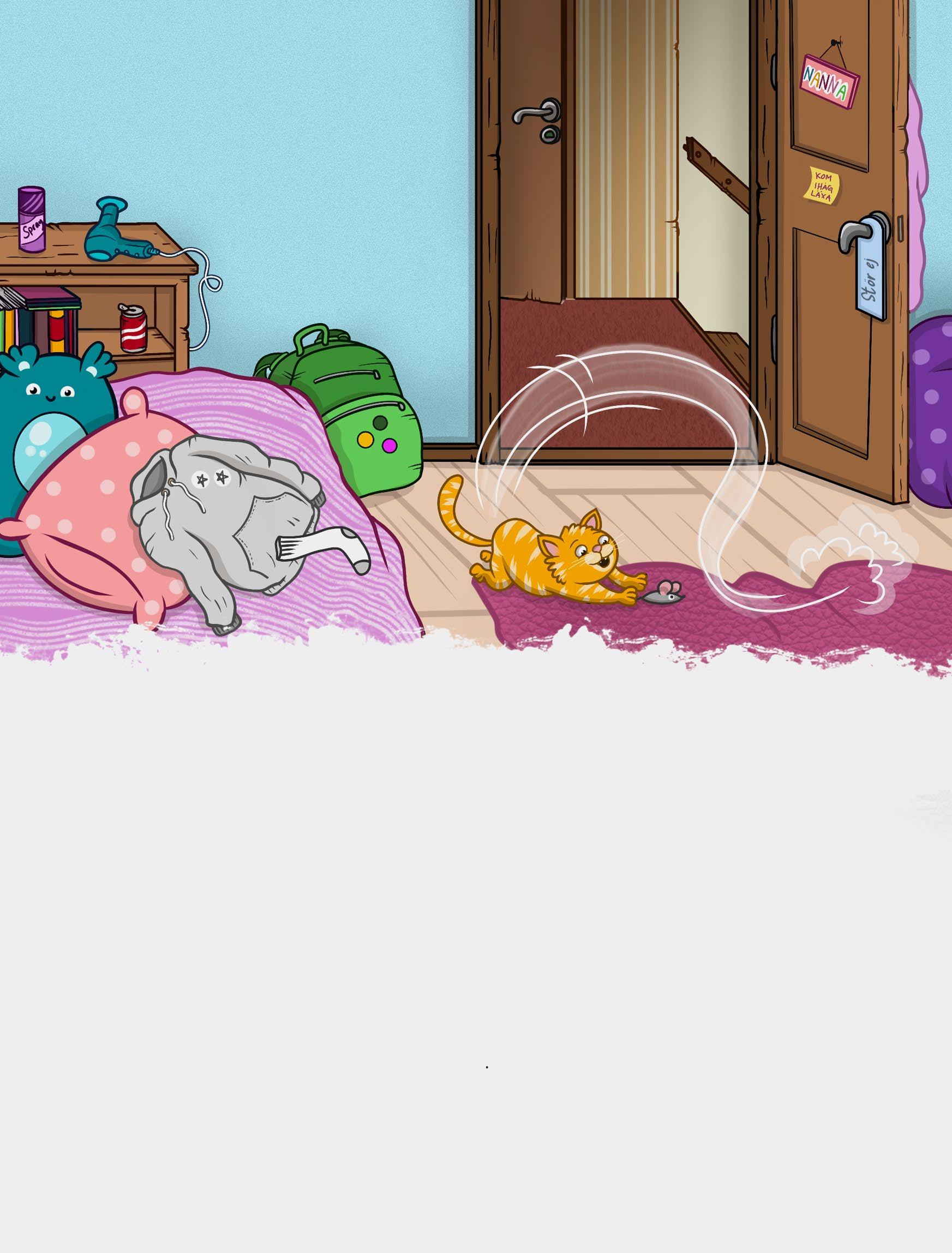 Nanna, Samir och Mira sitter i soffan i Nannas rum. Nannas katt springer fram och tillbaka på golvet och jagar en liten leksaksråtta.