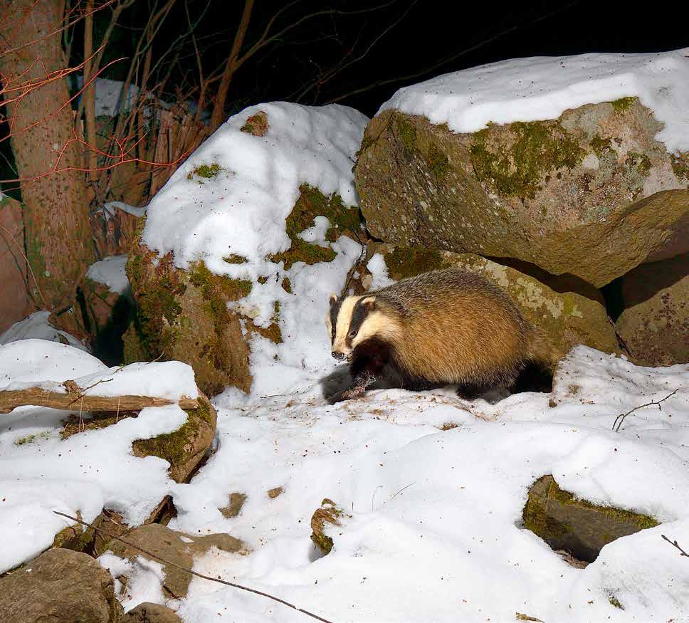 Detta fascinerar så till den grad att grävlingsgrytet besöks vid upprepade tillfällen. Vid denna tid på året råder vädermässig kamp mellan den föregående vintern och den avlösande våren. Någon dag med nysnö följd av dag med barmark och sedan snö igen. Fram och tillbaka. Att det, trots att vintern inte riktigt vill lämna över till våren, försiggår viss nattlig aktivitet vid grytet är det ingen tvekan om men det blir aldrig någon riktig fart dessa kalla vårvinterdygn. Kanske är det bäst att invänta mer av vårvärme och återkomma till området runt grytet. Framåt april månad är det nog dags för grävlingarna att röja ut grytets vinterrustning i form av mossa och gräs. Då blir det nog mer fart på dem. Tills dess kanske några solrosfrön i grytets närhet kan intressera grävlingarna. Eller så finns där några andra hugade spekulanter på de feta fröna. Varför inte skogsmöss? De är aktiva under vintern precis som flertalet andra däggdjur.