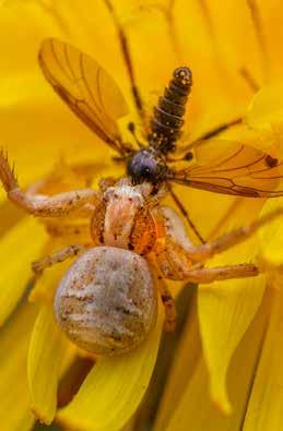 Krabbspindeln med sitt byte i maskros en varm vÄrdag.