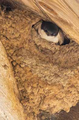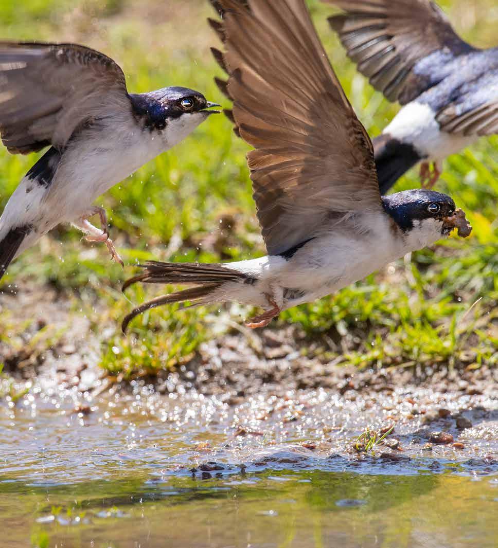 Hussvalor samlar bomaterial i en vattenpöl pÄ Hovdala slott. De tar leran och bygger sitt bo vid taknocken dÀr de föder upp sina ungar. Varje kull krÀver flera miljoner insekter för att vÀxa upp.