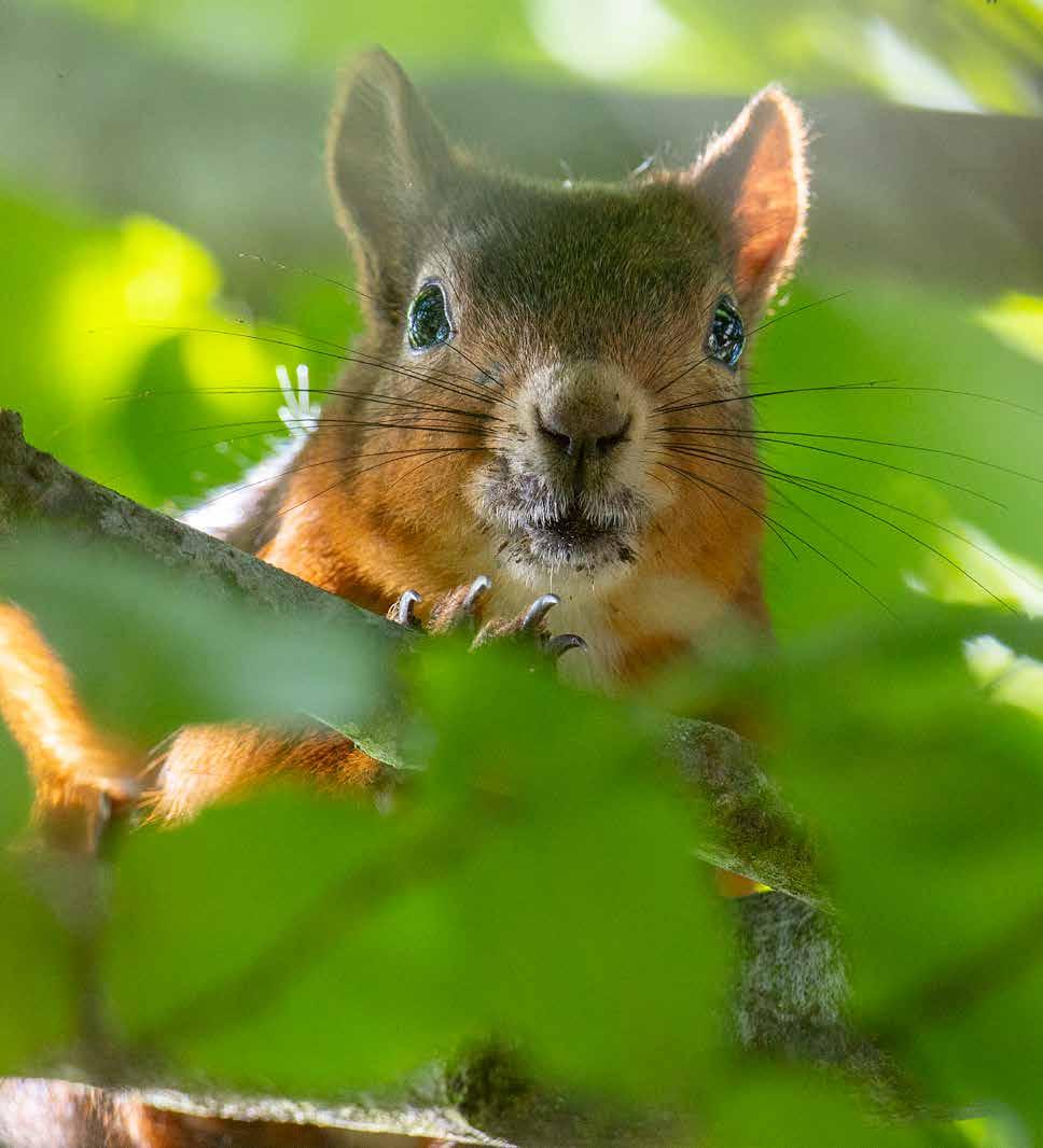En ekorre tittar ner pÄ vÀrlden frÄn en gren i sitt trÀd i sin skog, som vi gjort till vÄr och styr över.