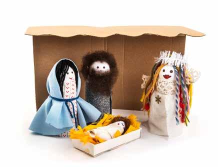 Skapa en julkrubba tillsammans i gruppen. Använd papprullar, stora flörtkulor, tyg, garn, piprensare, tovad ull och diverse dekorationsmaterial till figurerna och en kartong till stallet.