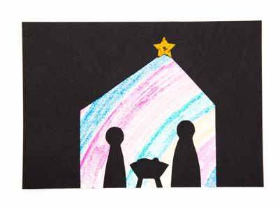 Måla ett A4-papper så det blir riktigt färgglatt. Ta ett svart papper i A4-format. Rita och klipp ut en kontur/ram av ett stall. Limma fast “stallramen” på det färgglada pappret. Rita och klipp ut Josef, Maria, Jesus och en krubba i svart papper och limma fast i stallet. Dekorera med en guldstjärna i toppen av taket.
