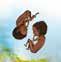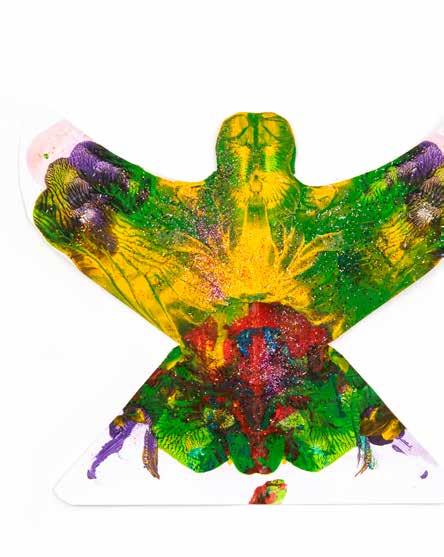Måla fotsulan med flytande färg. Trampa på ett papper. Måla sedan båda handflatorna med färg och tryck som vingar. Måla till sist ett huvud med vanlig pensel och färg.