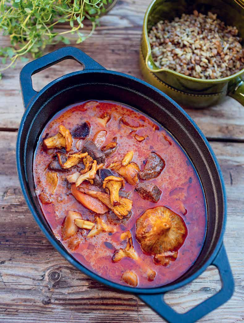 Stek kantarellerna i en torr stekpanna i cirka 5 minuter tills vÀtskan kokat in. TillsÀtt en klick smör och stek ytterligare nÄgra minuter. Salta lÀtt och rör ner svampen i grytan strax före servering. Servera med havreris eller potatis.