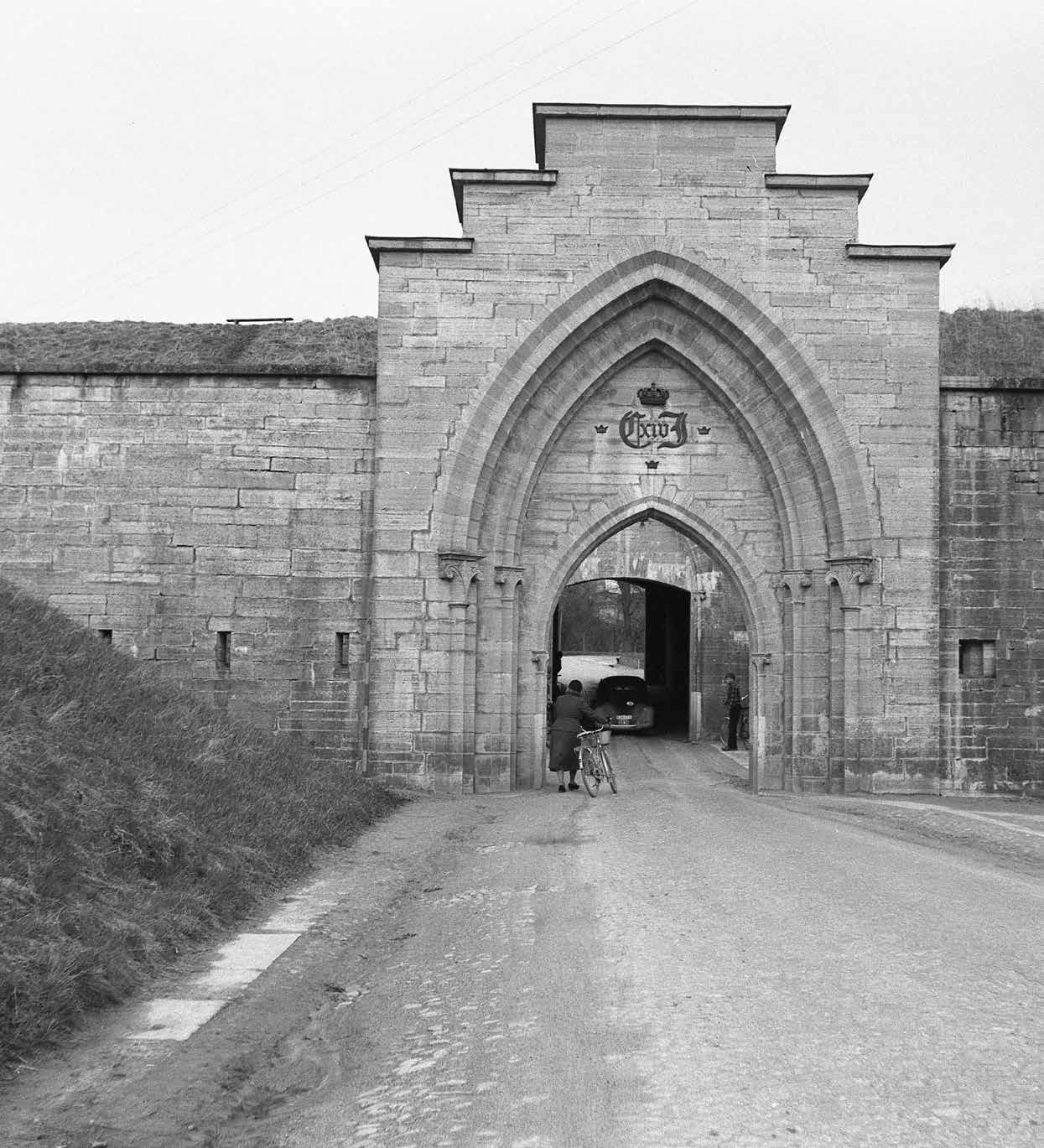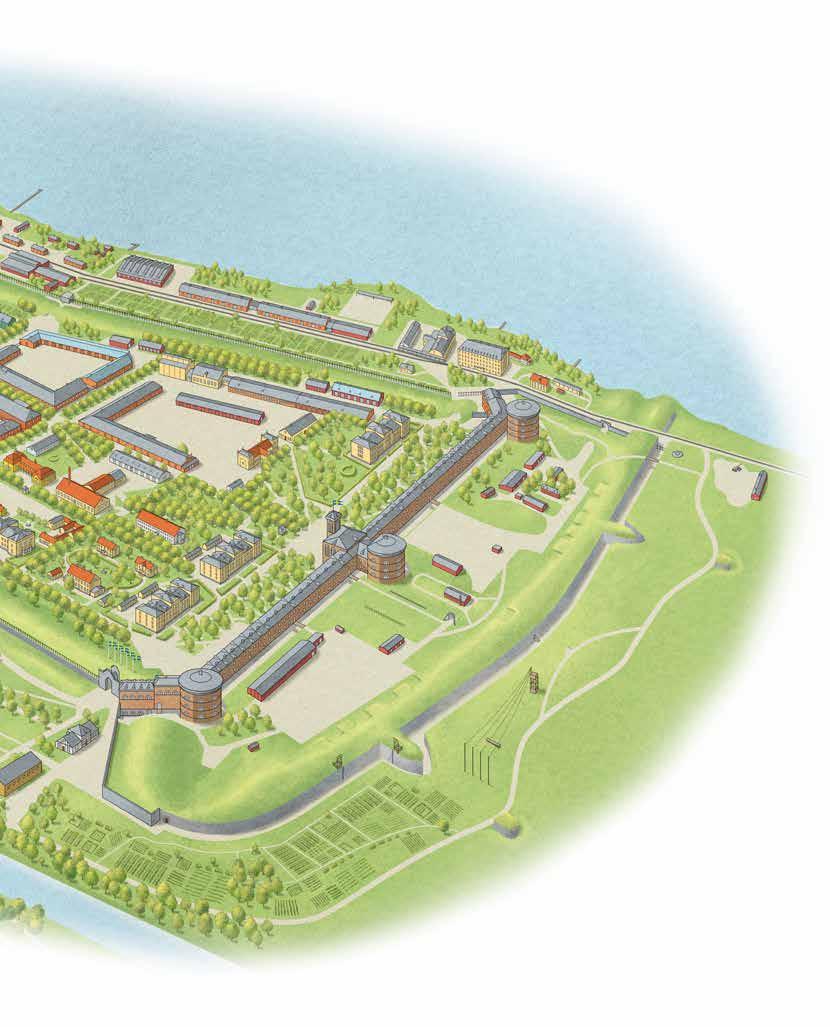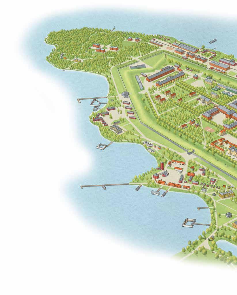PÄ de höga vallarna böljade grÀset som om det vore ett hav och runt dem tornade en tvÄ meter hög stenmur med ett stormgaller upp sig. För att komma till omrÄdets kÀrna bakom vallarna behövde man passera genom nÄgot av de stenvalv som ledde in till fÀstningen. DÀr inne möttes man av en by mitt i det militÀra med ett flertal affÀrer, frisör, telegraf och kyrka. PÄ VanÀs udde, i direkt anslutning till fÀstningen, lÄg garnisonssjukhuset med kirurg-, medicin- och BB-avdelning. FÀstningen var ett eget samhÀlle och ingen av de boende behövde söka sig utanför omrÄdet. Allt de behövde fanns dÀr.