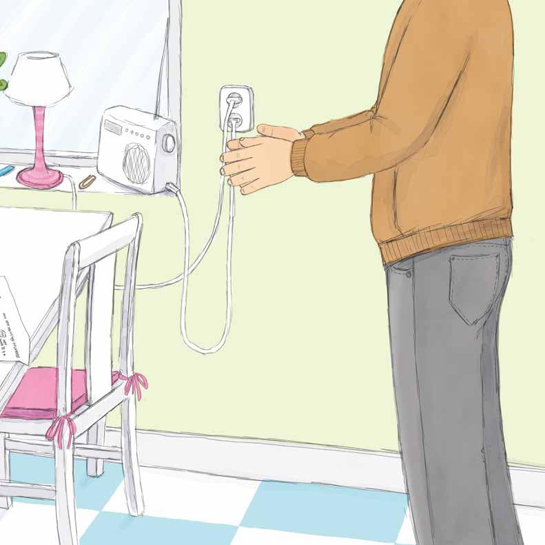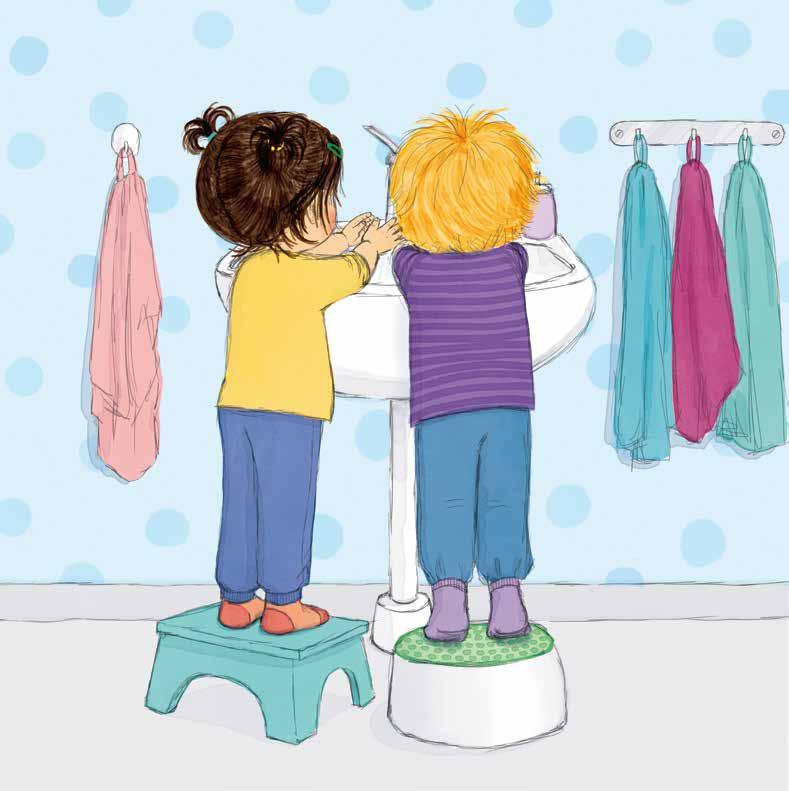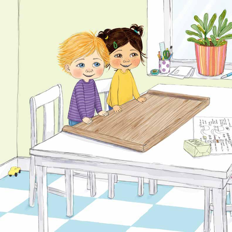 I köket klättrar de genast upp på stolarna vid köksbordet. Men då ropar