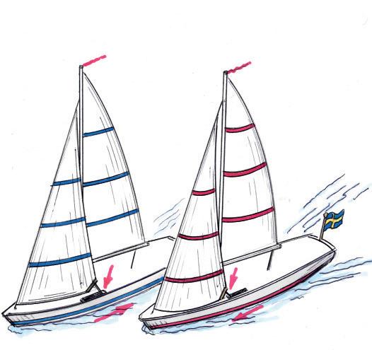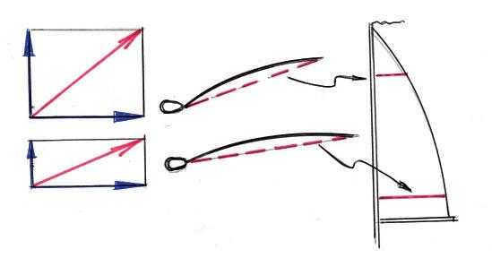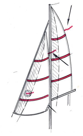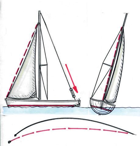 Detta gör att seglet får en mindre vinkel, i dess övre del, mot vinden vilket gör det mer verkningslöst, vilket minskar båtens krängning. Drar du i stället fram seglets skotpunkt så ökar seglets form och bukighet (B).