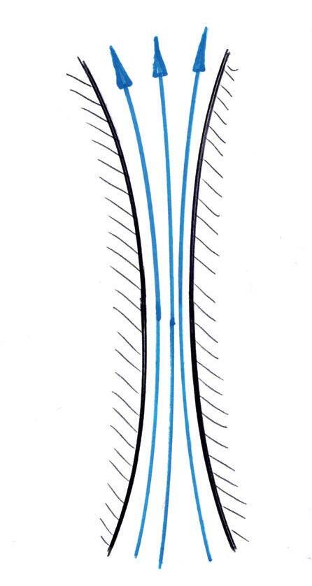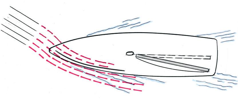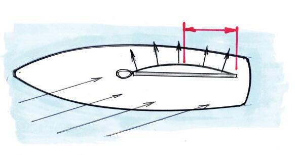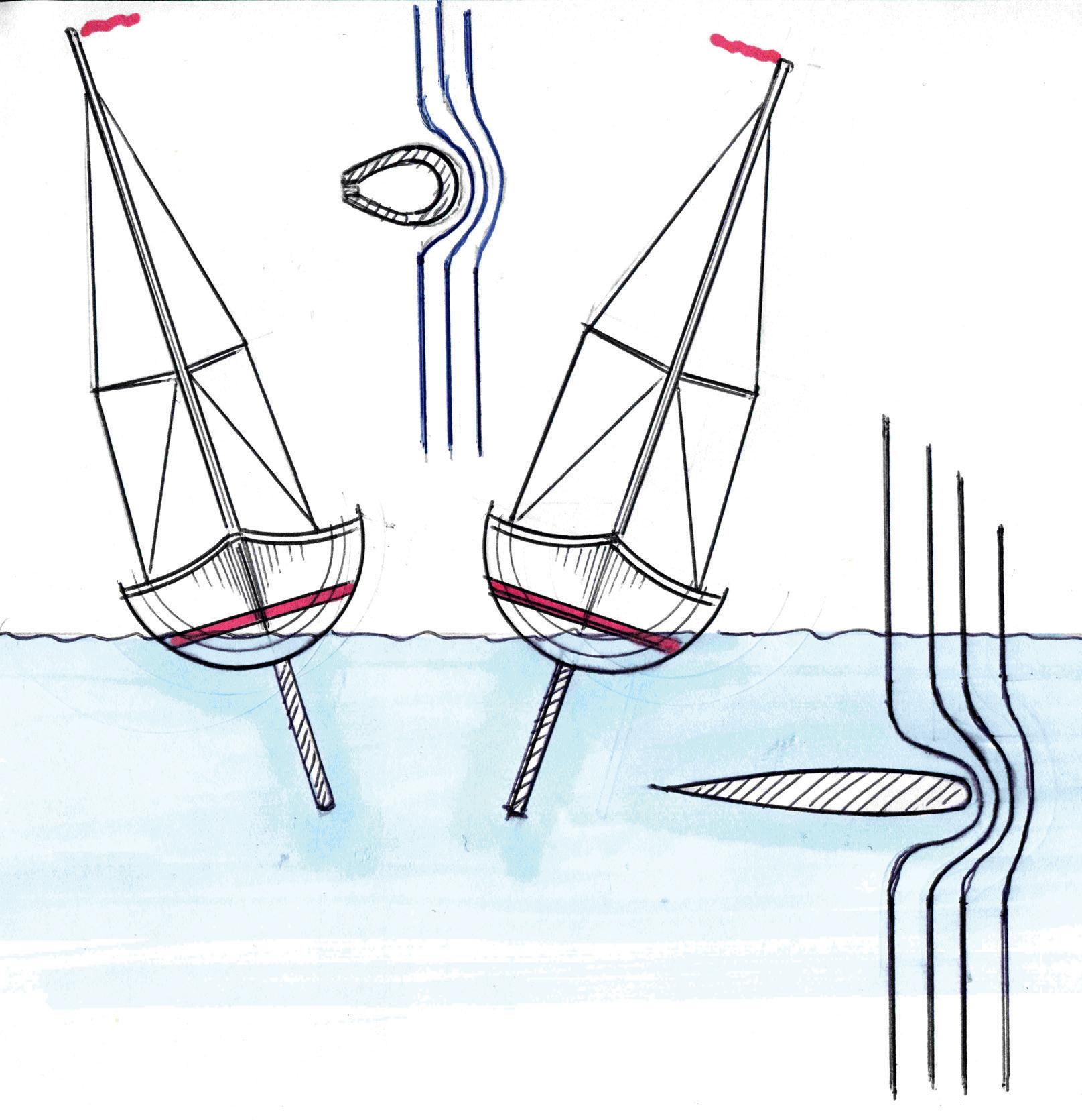 BArunda framkanter B så uppstår ett sug vilket drar fram båten. På samma sätt strömmar luften runt mastens runda framkant A vilket även det drar fram båten. Det är detta fenomen som gör att ett flygplan kan flyga och segelbåt segla.