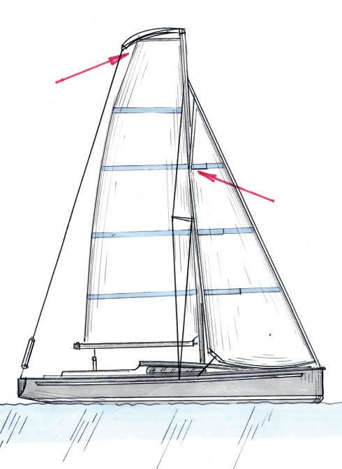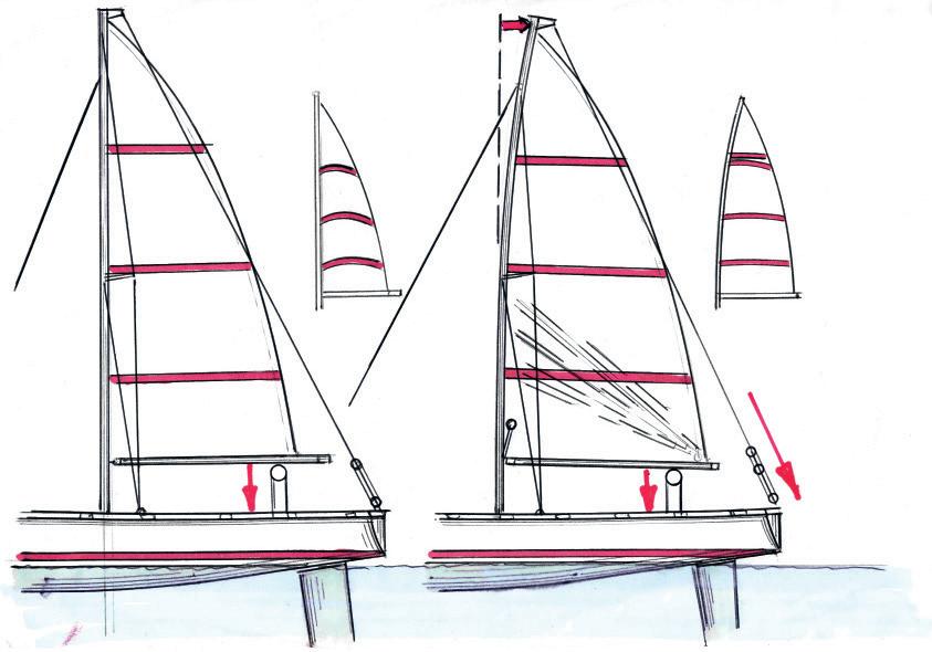 Båten (A) har en inbyggt profil/form i seglen. Genom att enligt (B) spänna båtens akterstag hårt (måste spännas mycket) så kan du böja masten (likt en pilbåge). Genom mastens böjning trycks dess mittdel framåt vilket planar (drar) ut seglets profildjup (minskar formen). I stället för att reva storen får du ungefär samma effekt genom att ”krumma” masten och det är enklare och snabbare att göra. Genom att även skota seglet lite hårdare kommer seglet att planas ut.