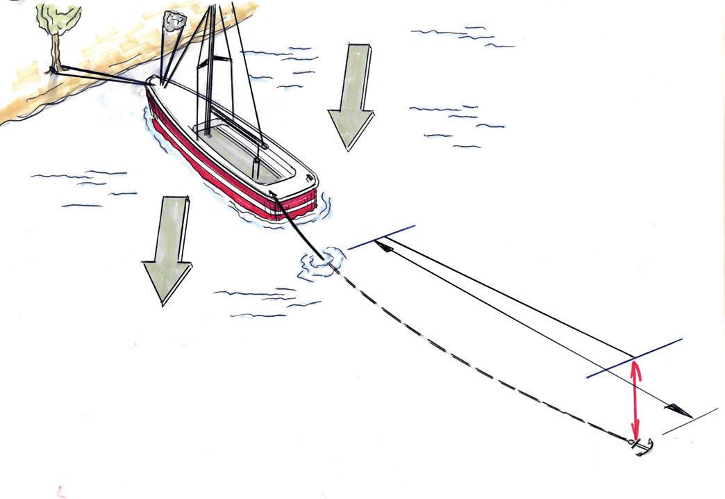 sig till den raka och tänkta linjen in mot land. Det är viktigt att du kör så sakta som möjligt. Dra av på gasreglaget så att motorns växel ligger i med så lågt varvtal som möjligt. Att hålla högre fart in mot land kommer både du och dina medpassagerare att uppleva som stressande. När du börjar din anloppssträcka så ber du att den som sköter ankaret att han/hon i god tid halar ner det så att det ligger minst en halvmeter under vattenytan. Cirka 5 meter innan den plats där du vill ha ankaret (25 meter från land) ber du att ankaret skall halas ner. När ankaret nått sjöbotten bör man därefter hålla ut ankartampen lite från båten och hålla den lite sträckt för att minska risken att den hamnar i propellern.