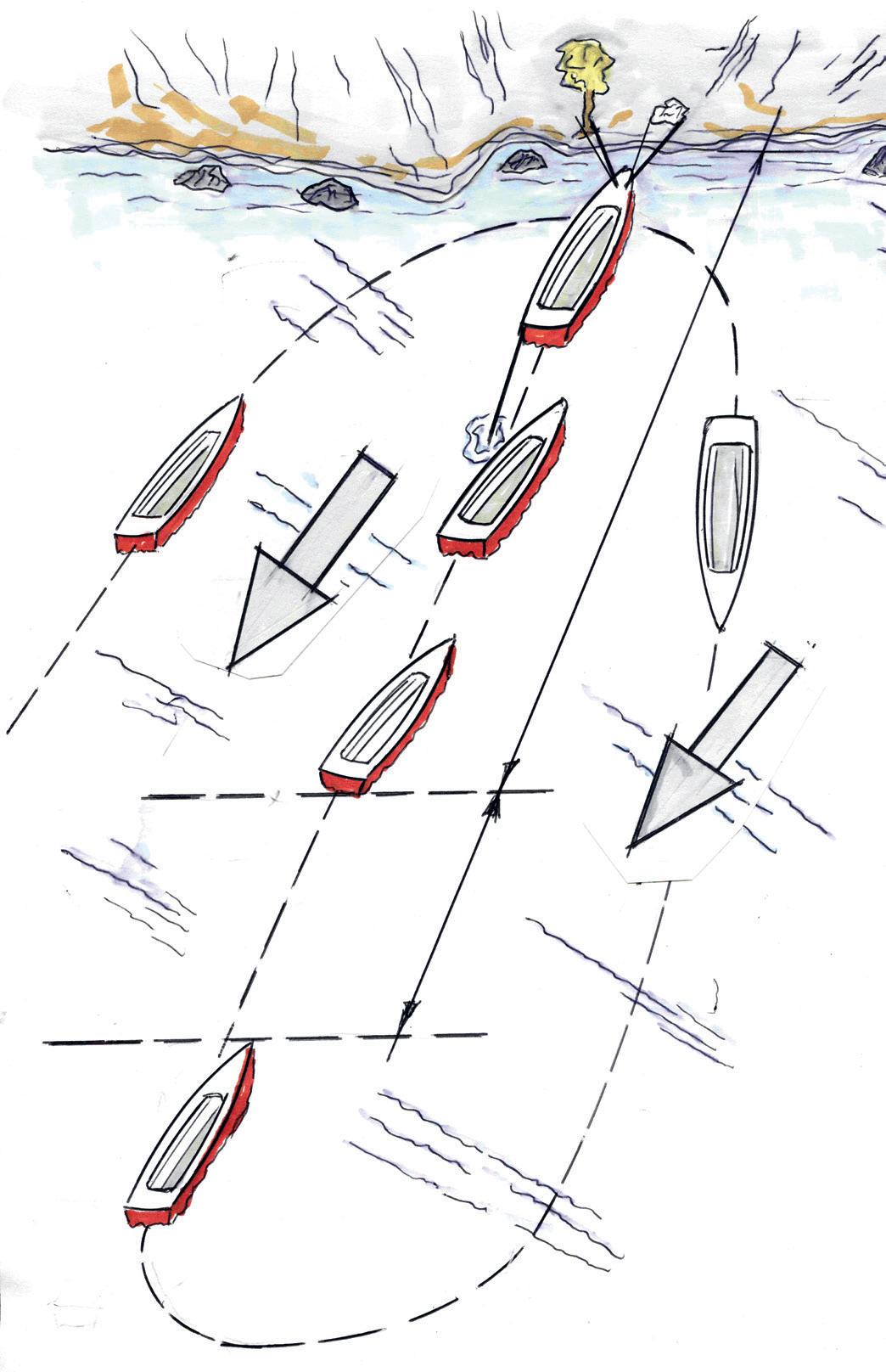 I det här skedet är det viktigt att den som håller i ankartampen inte bromsar båten så att farten därför inte räcker till hela vägen in till stranden.