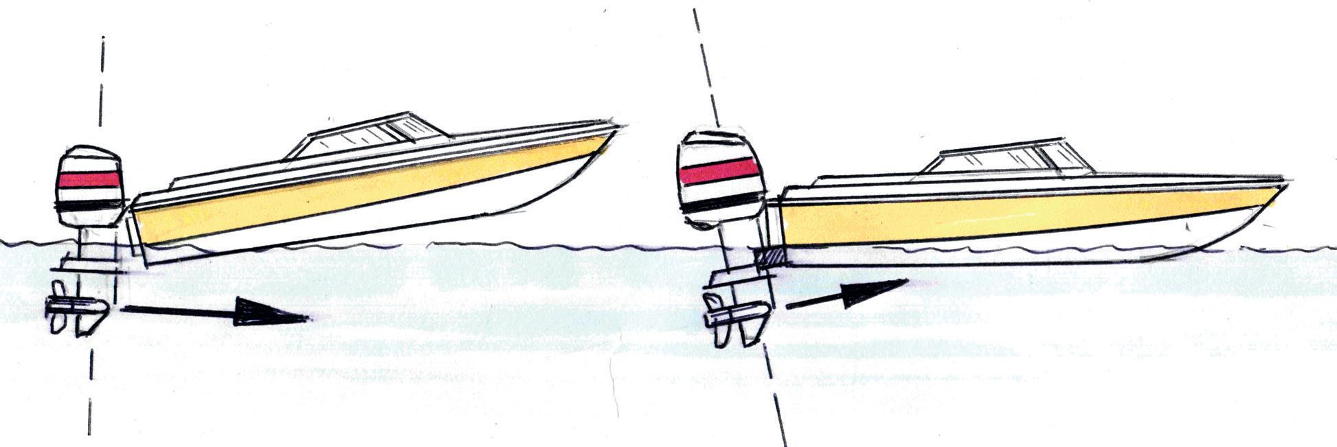 A gör betydligt större svallvågor jämfört med B. Genom att som B vinkla in motorn maximalt och om det finns trimplan även fälla ner dom, så minskar vågbildningen.