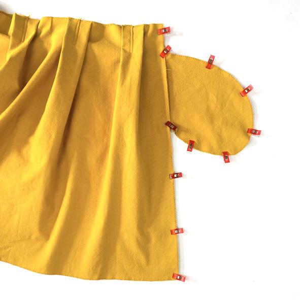 5 . Lägg nu kjolens fram- och bakstycke räta mot räta ovanpå varandra De två fickorna ligger då också räta mot räta ovanpå varandra utanför kjolen Nåla samman kjolens sidor och fickornas rundade ytterkant.