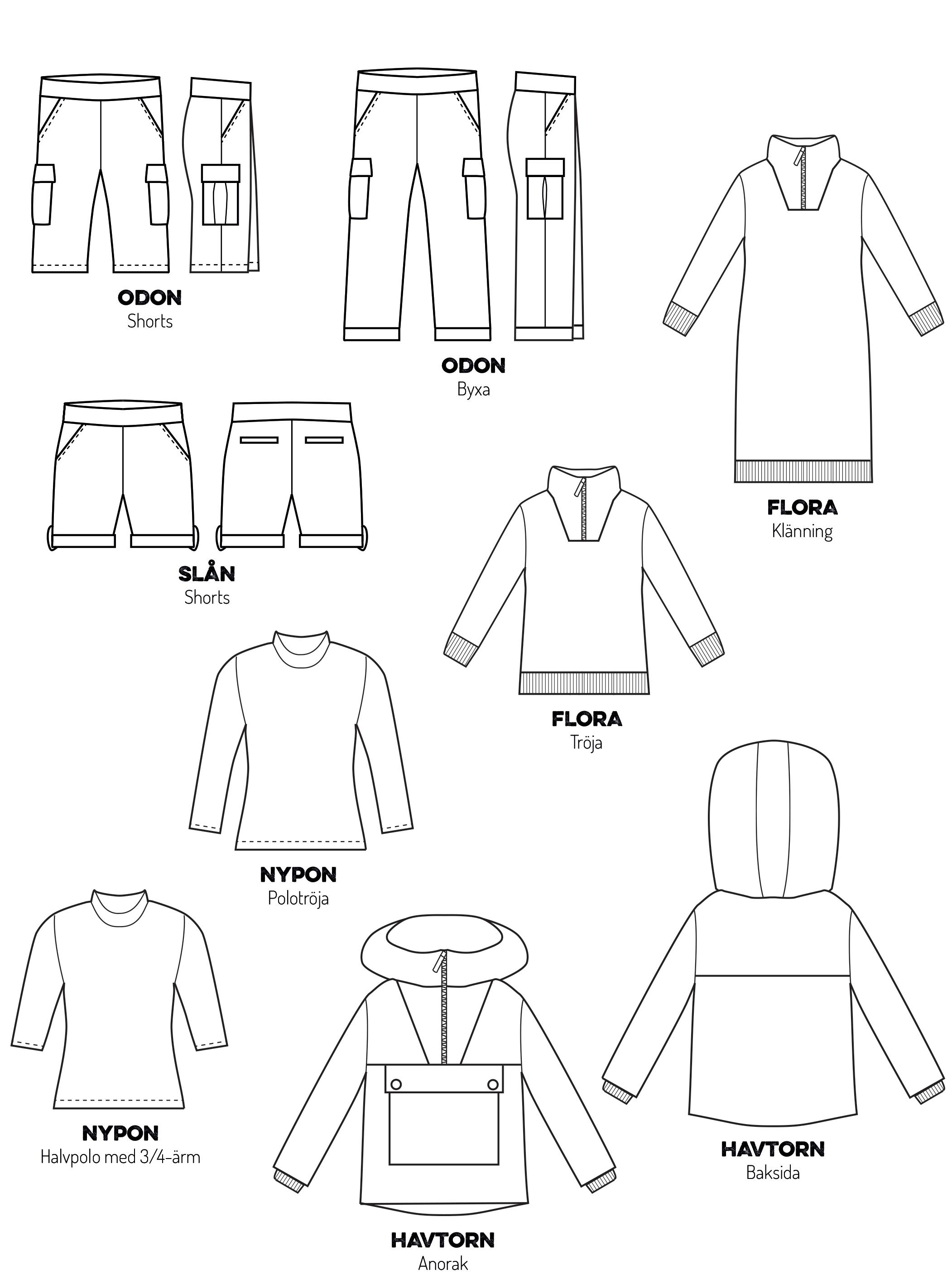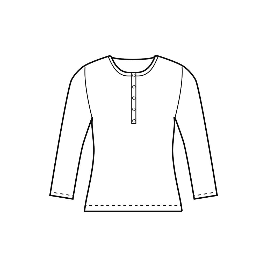 1 . Rita av och klipp ut mönsterdelarna i ditt valda tyg Kom ihåg att lägga till sömsmån och fåll Till tröjans nederkant rekommenderar vi en fåll på 3 cm och till ärmarnas nederkant 2 cm Knapplistens mönsterdel klipps utan sömsmån .
