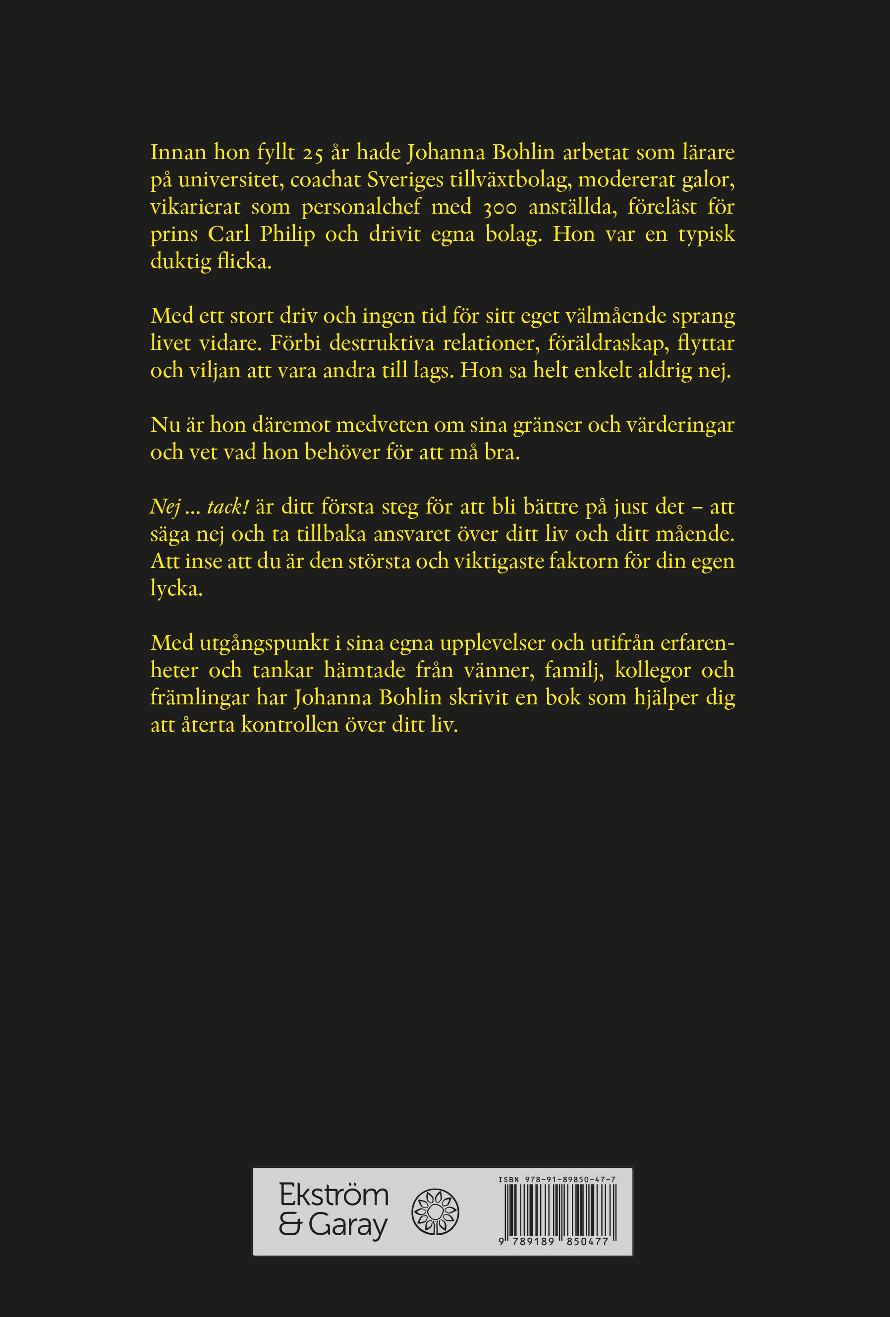 Det vi ska ta reda på tillsammans är vad du – som har svårt att säga nej – kan göra för att förebygga ett liv fullt av stress och depressioner. Hur du får mer tid till dig själv, det du tycker om och mår bra av. Precis det ska vi gå igenom i denna bok, steg för steg.