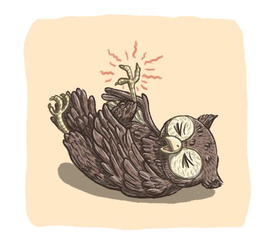 Ugglan kraschar i hålet som Misse låg i och slår i sitt ena ben. Ugglan hoar högt: