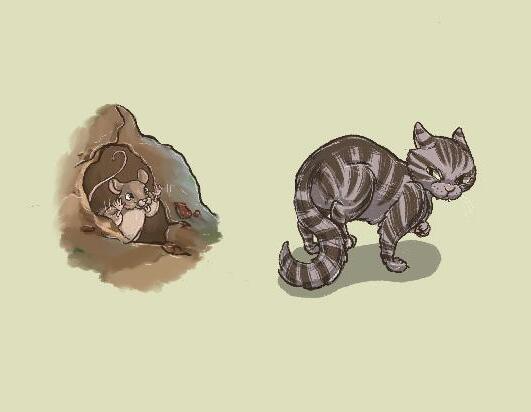 Misse blir fundersam. Ett rovdjur …, tänker han. Det är det enda han hinner tänka, innan en annan varelse fångar hans uppmärksamhet. En mus, med munnen full av ekollon, sitter längre bort i gläntan.