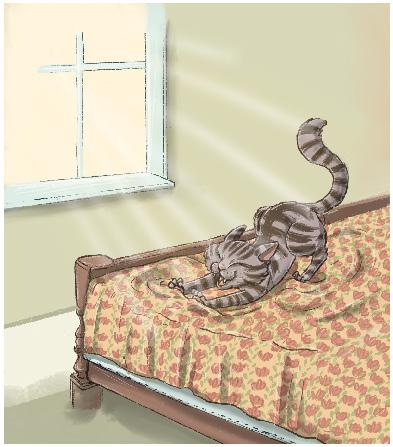 I ett rött hus med vita knutar ligger det en katt som heter Misse på en mjuk säng. Han vaknar och sträcker på sig för att morna sig, redo för dagens äventyr. Plötsligt börjar hans mage kurra, så han hoppar ur sängen och går nerför trappan.