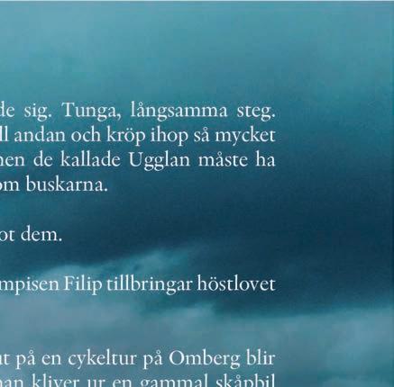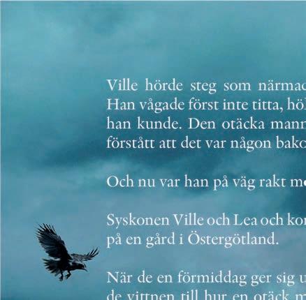 smattrade mot framrutan. Farfar satte vindrutetorkarna på högsta fart. De gnisslade och lämnade en irriterande liten äck, mitt framför Ville. Då och då kastade en mötande bil upp en vattenvåg över rutan och Ville spände kroppen lite extra. Han sneglade oroligt på sin farfar. Såg han verkligen tillräckligt bra för att köra i det här ovädret? Sist han frågat hade farfar sagt att han såg som en hök om natten. ”Som en hök, Ville!” Men Ville hade aldrig sett en hök med tjocka glasögon. Ingen annan fågel heller för den delen.