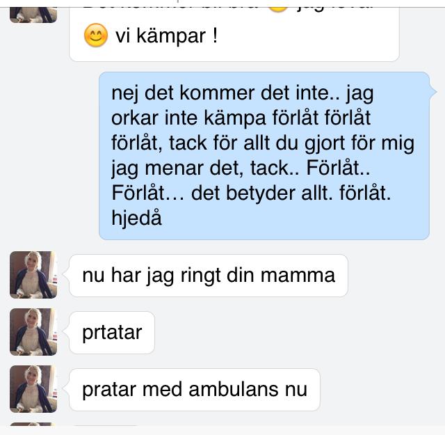 Jag upplevde ett inre lugn. En tystnad i mig som bekräftade allvaret i varje ögonblick som nu passerade. Innan jag skulle lämna lägenheten skrev jag till min numera mycket nära vän, Ida-Maria. Jag skrev hur jag inte orkade leva mer och hur trött jag var på allt. Ida-Maria svarade att allt kommer bli bättre, att det kan bli bra. Vi skrev lite till och jag avslutade med: ”Förlåt, men jag orkar inte”.