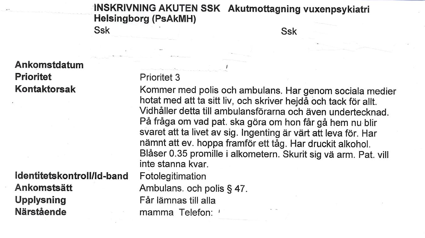 Den kvinnliga polisen la handen på min högra axel och med vänlig röst sa hon till mig att jag behövde följa med och att jag nog förstod det själv. Men det gjorde jag inte, inte alls. Följa med vart och varför? Att dagen som skulle avsluta allt, radera mig från kartan, blev början på ett helt nytt kapitel i mitt liv var inget jag någonsin kunde drömma om. Psykiatrin, som oftare benämndes som ”femte våningen”, skulle nu bli mitt hem för år framöver. Efter mycket tårar körde de in mig till Helsingborgs lasarett. På akutmottagningen för dårar visades jag först in i ett mindre rum som påminde om de fängelseceller jag sett på film. Rum med endast en bänk och längst in en toalett i plåt. Spegeln, även den i plåtliknande material, som skapade den skeva spegelbild jag kände mig som.