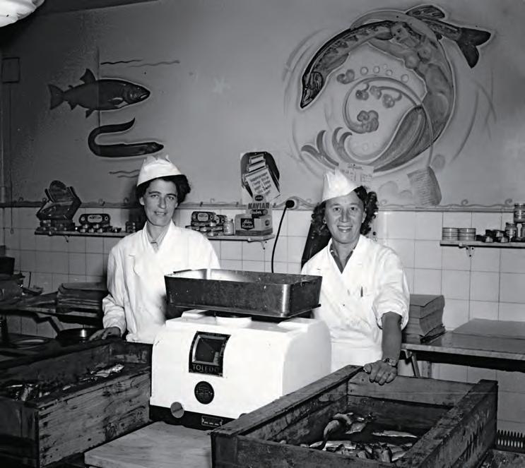 Väggmålning i en fiskbutik i Malmö i slutet av 1940-talet. Att dekorera butiker och restauranger var en viktig inkomstkälla för flera av målarna.