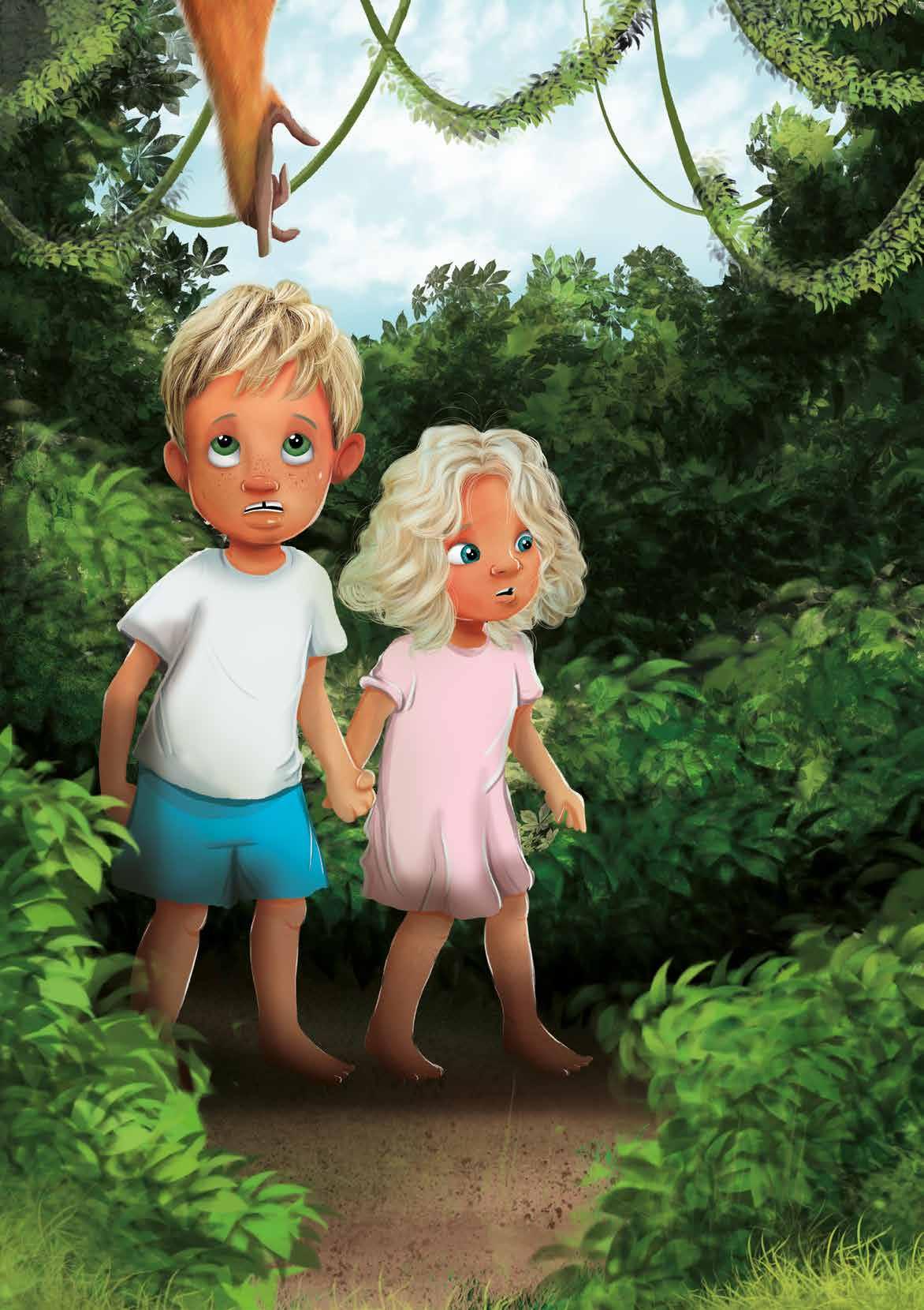 Det snurrade fortfarande runt dem när de öppnade sina ögon. Som när man precis åkt en bergodalbana. Vimsiga och lite illamående ställde de sig upp. För några sekunder sedan hade de stått i dörröppningen till sin lekstuga. Nu var de i en djungel …?