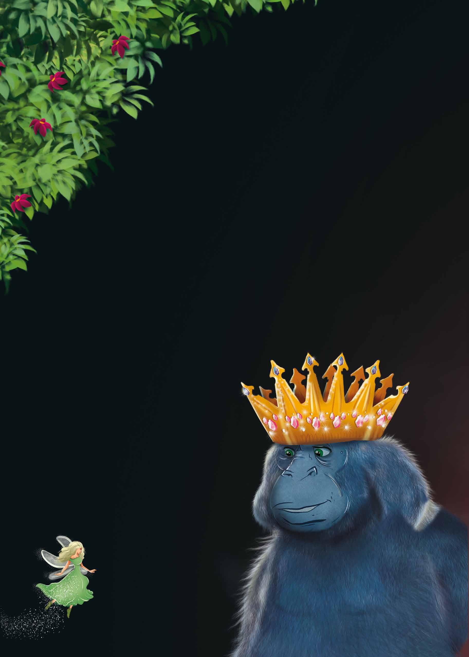 I en av ljusspringorna såg de någon, eller något, som sträckte ut sin hand. Utan att tänka sträckte Charles upp sin hand. På ett ögonblick rycktes han och Clara blixtsnabbt upp bland blad och grenar. Mitt emot dem satt en stor och glosögd apa. Den var väldigt hårig och nästan persikofärgad.