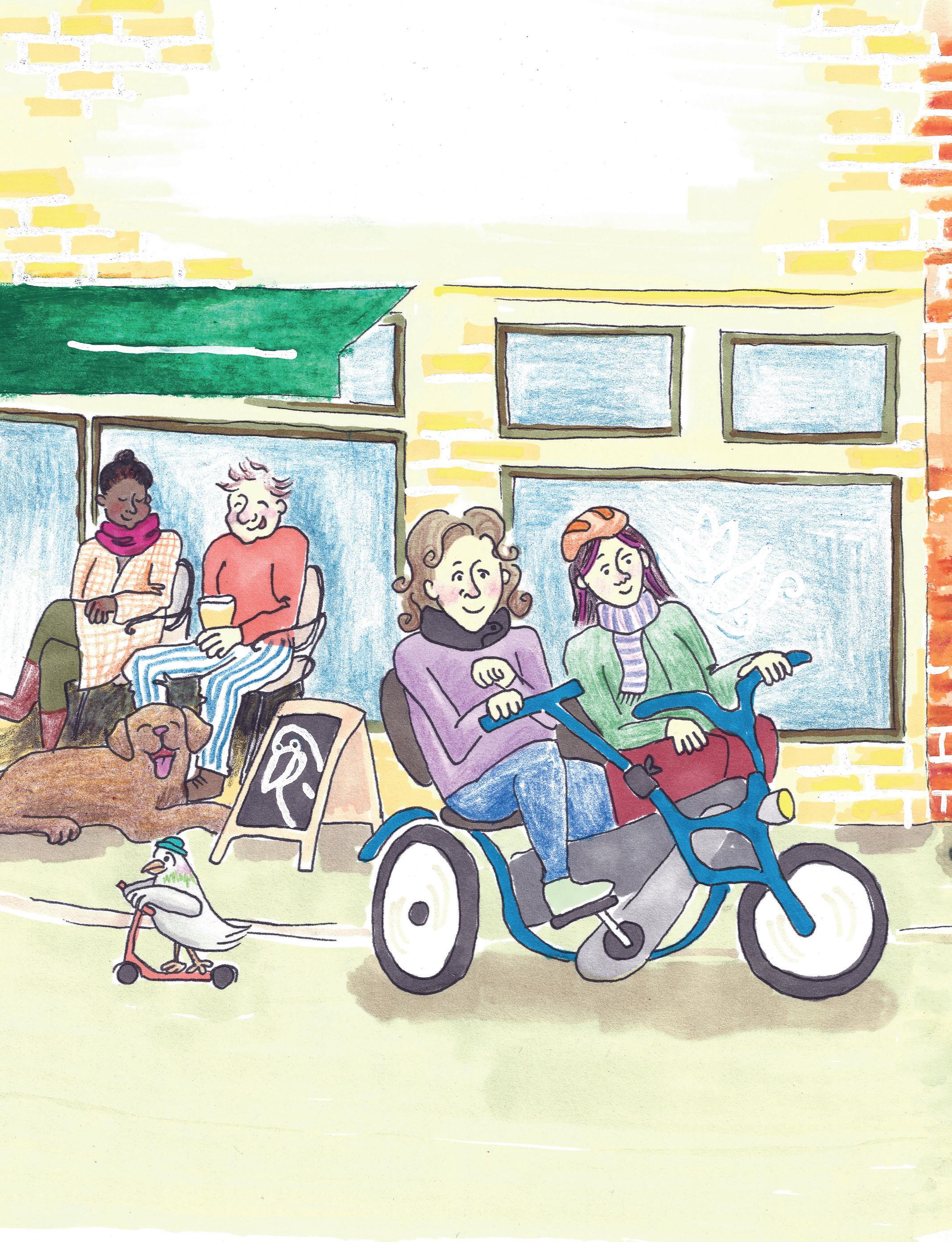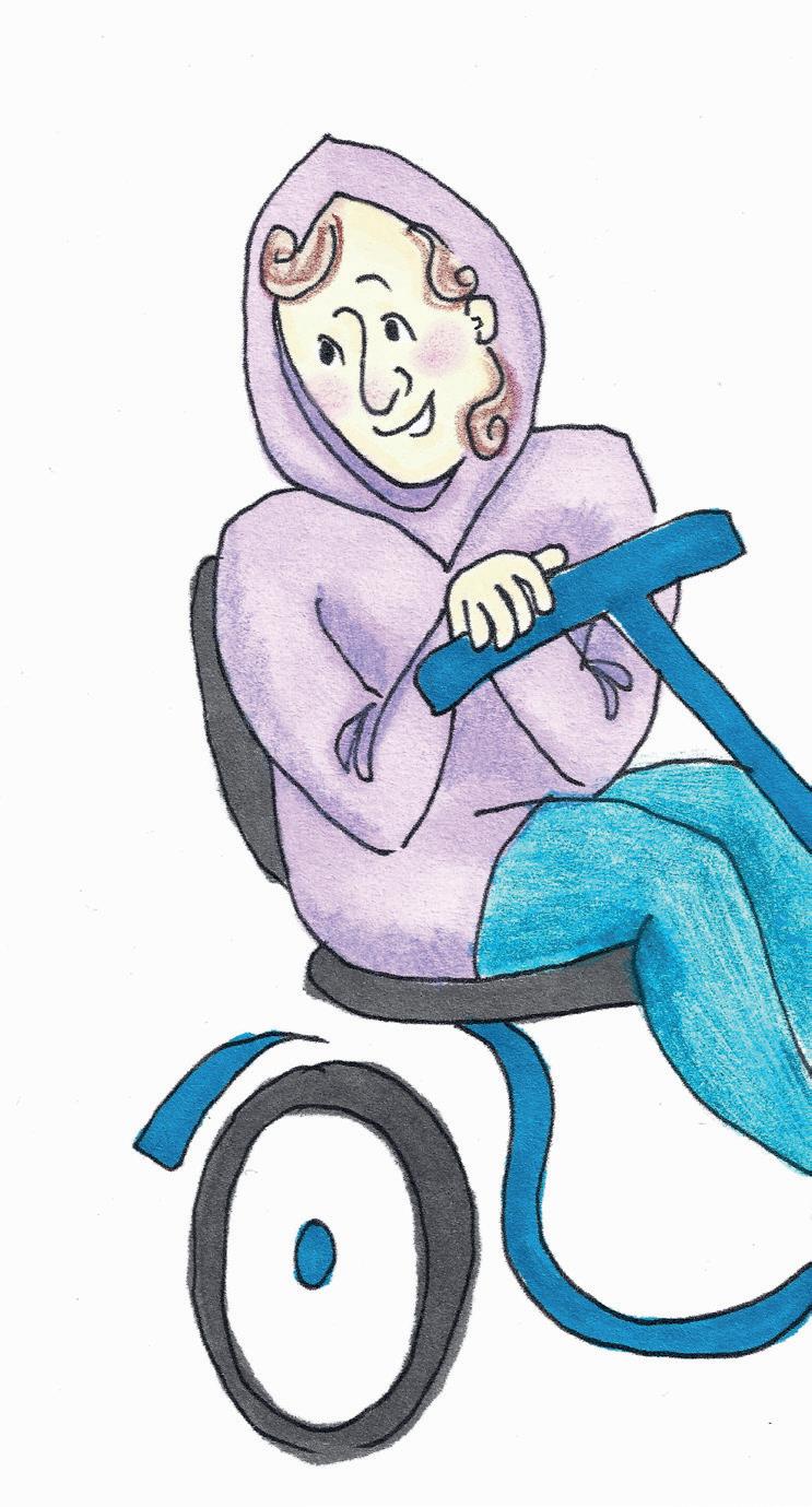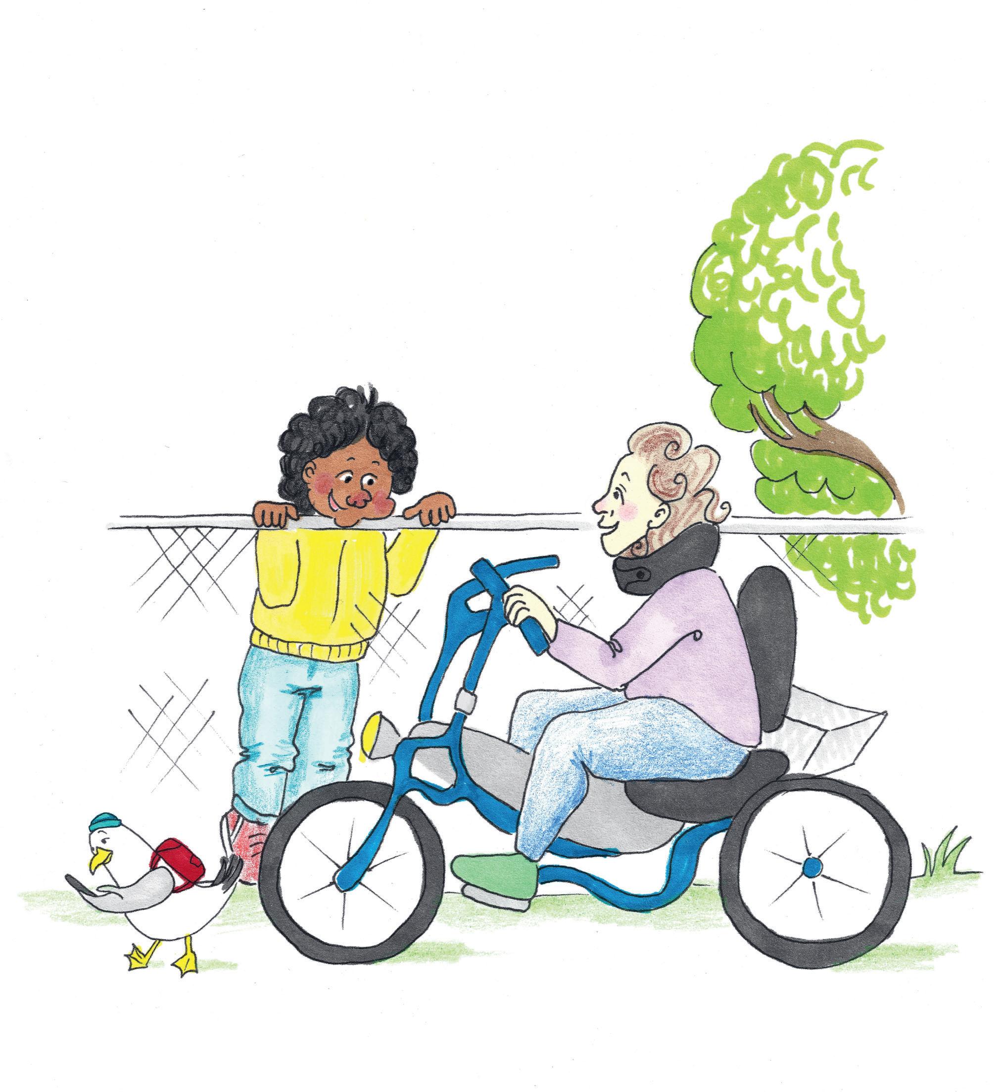 Pojken ser ofta den där ovanliga cykeln. Han vill ha en egen sådan. Men föräldrarna säger nej eftersom de har sett att tanten har ett funktionshinder och att hon därför har en speciell sorts cykel.