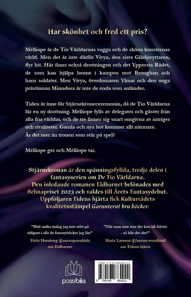 Stjärnekronan ikapp med hennes leende. De lila obeliskformade kristallerna sträckte sig mot taket från varje spets. De var klara och behagliga att se på. Enkla i jämförelse med basen av kronan som var täckt av lila och vita stenar. Ljuset från salen tycktes dras in i dem för att sedan kastas ut i alla riktningar. Varje liten rörelse drottningen gjorde fick kronan att glittra så mycket att det var svårt att skönja detaljer och mönster. Längst fram, som en lugn, purpurfärgad tjärn, var en sten infattad som ögat kunde vila i.
