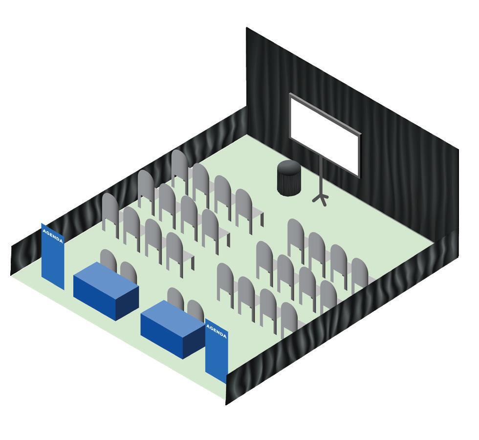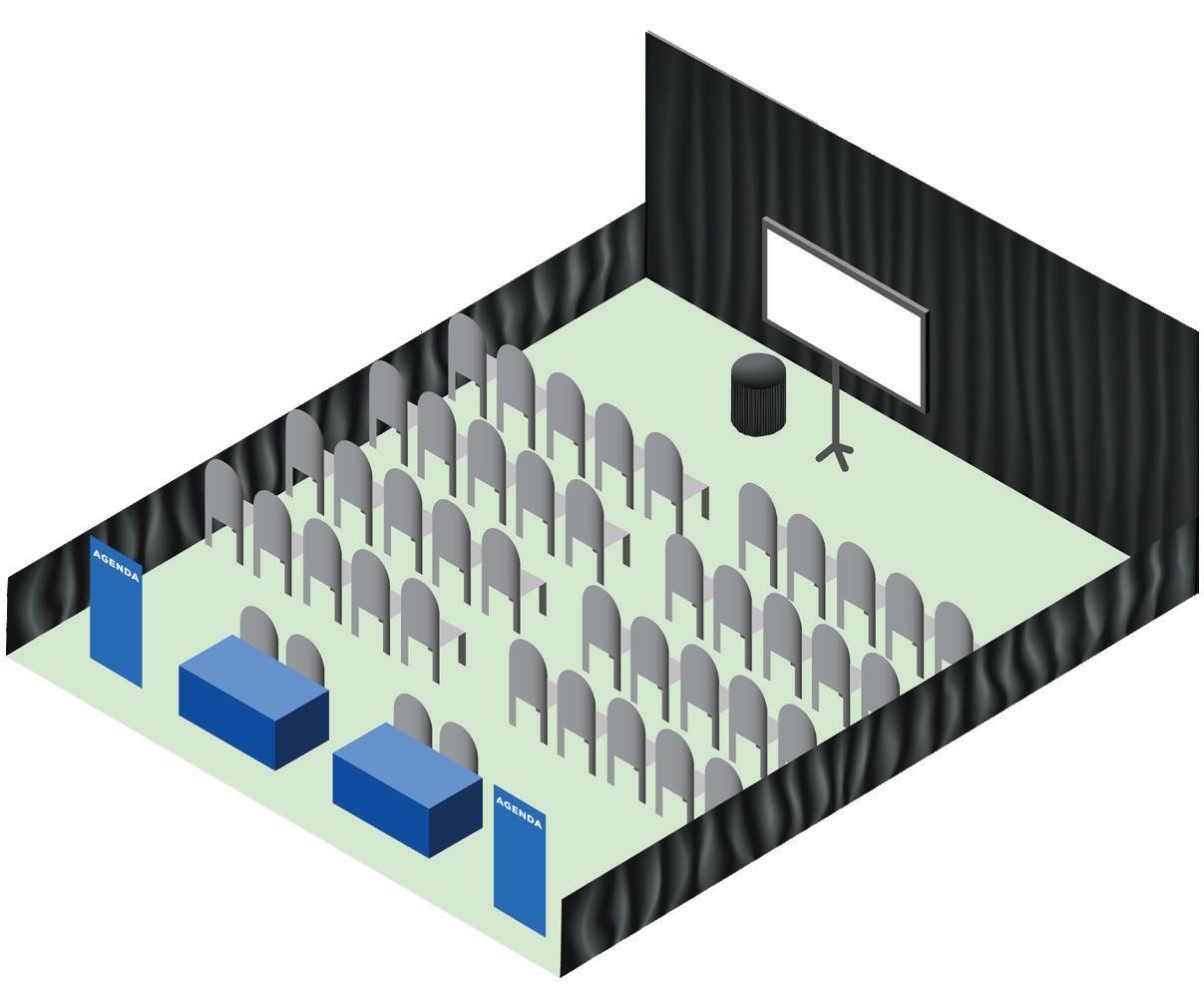 • 65” TV on Stand, Microphone, 5AMP Power Drop, (2) Tables, Chairs