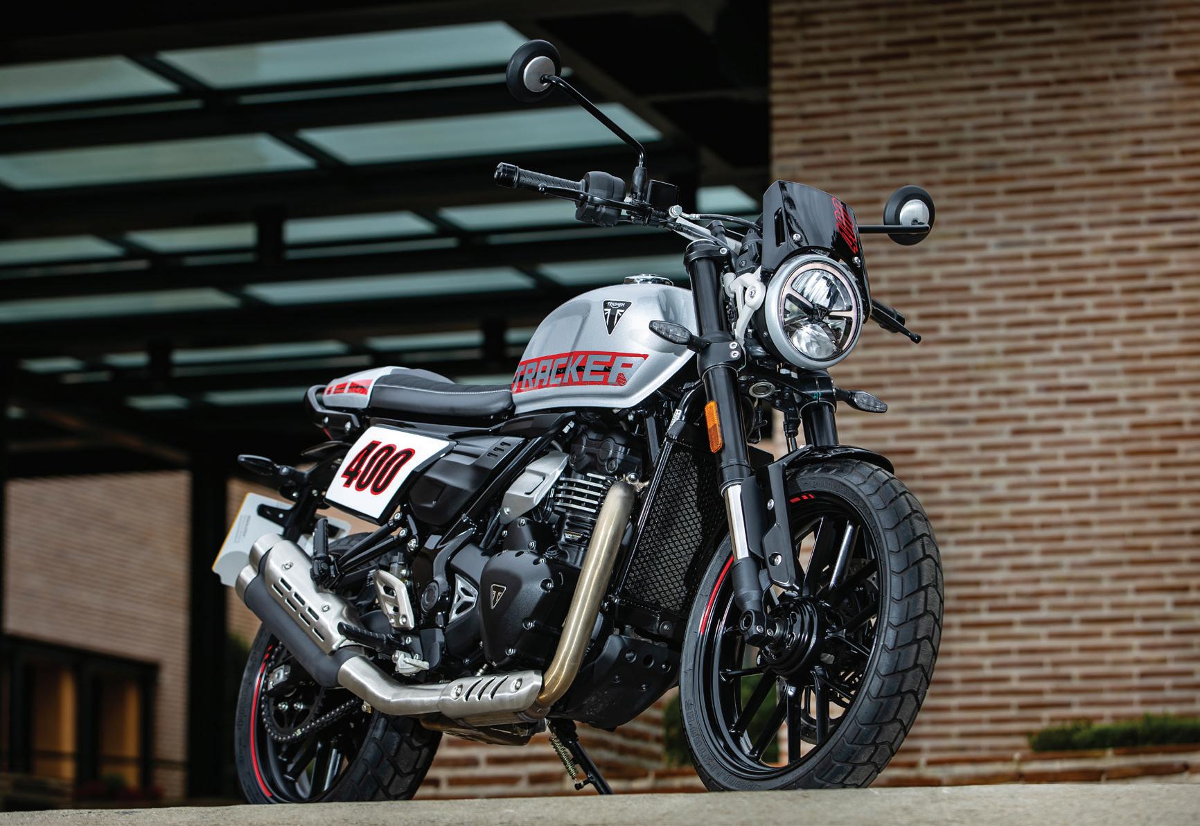Neuster Zuwachs in Triumphs 400-Kubik-Klasse ist die Tracker 400, die sich mit ihrem klaren Flat-Track-inspirierten Design optisch deutlich von der breiten Masse abhebt. Trotz ihres attraktiven Einstiegspreises überzeugt die Tracker 400 mit umfangreicher Ausstattung und hoher Verarbeitungsqualität. Eine schwarz eloxierte 43-mm-Upside-down-Gabel, ein einstellbares hinteres Federbein, griffige Pirelli-MT60-RSBereifung sowie Vierkolben-Radialbremssättel mit Bosch-ABS unterstreichen den hochwertigen Anspruch und sorgen für präzise Kontrolle sowie souveräne Performance.