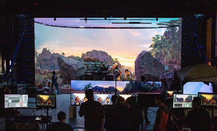 the production team generates and manipulates in real time. Instead of actors performing in real-world locations or green screens, they perform in front of a giant volume of LED panels with animated backgrounds that respond to the camera’s movement with accurate parallax.