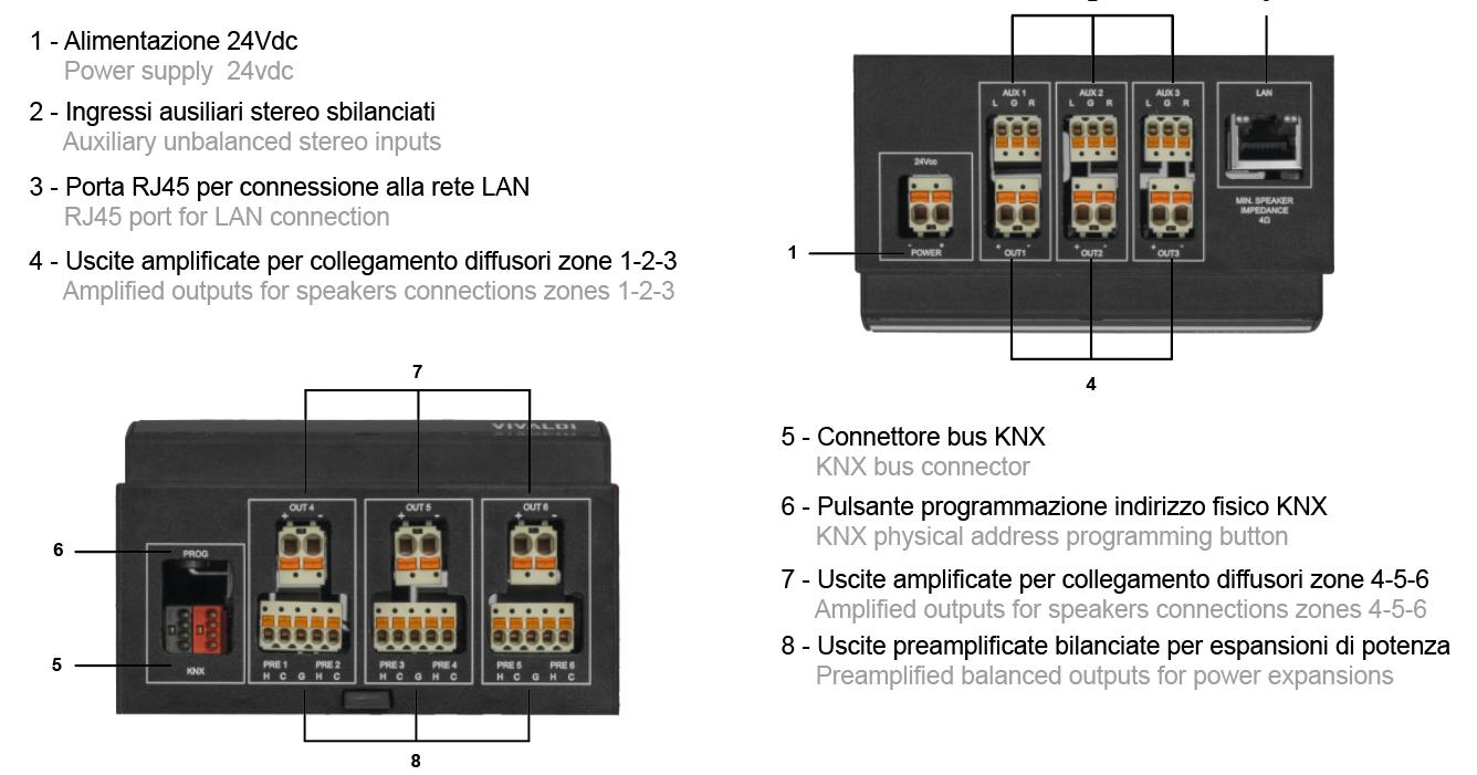 • 6 amplificatori audio per collegare diffusori 8 Ohm