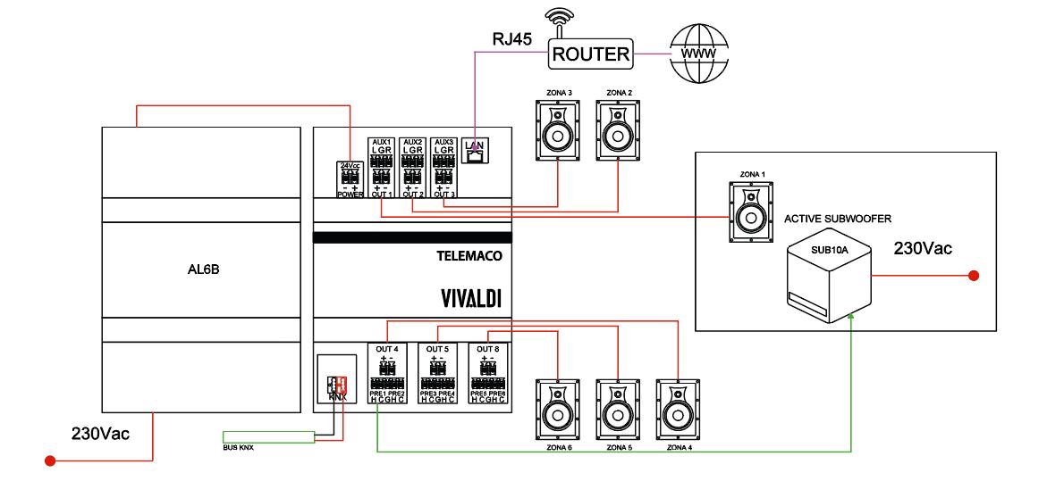 Un prodotto pensato per le abitazioni da 6 moduli DIN all-in-one, con 4 player multisorgente, per la diffusione sonora in 6 zone espandibile fino a 12 master ed altre slave. Progettato per le abitazioni. Connesso alla rete LAN della casa.